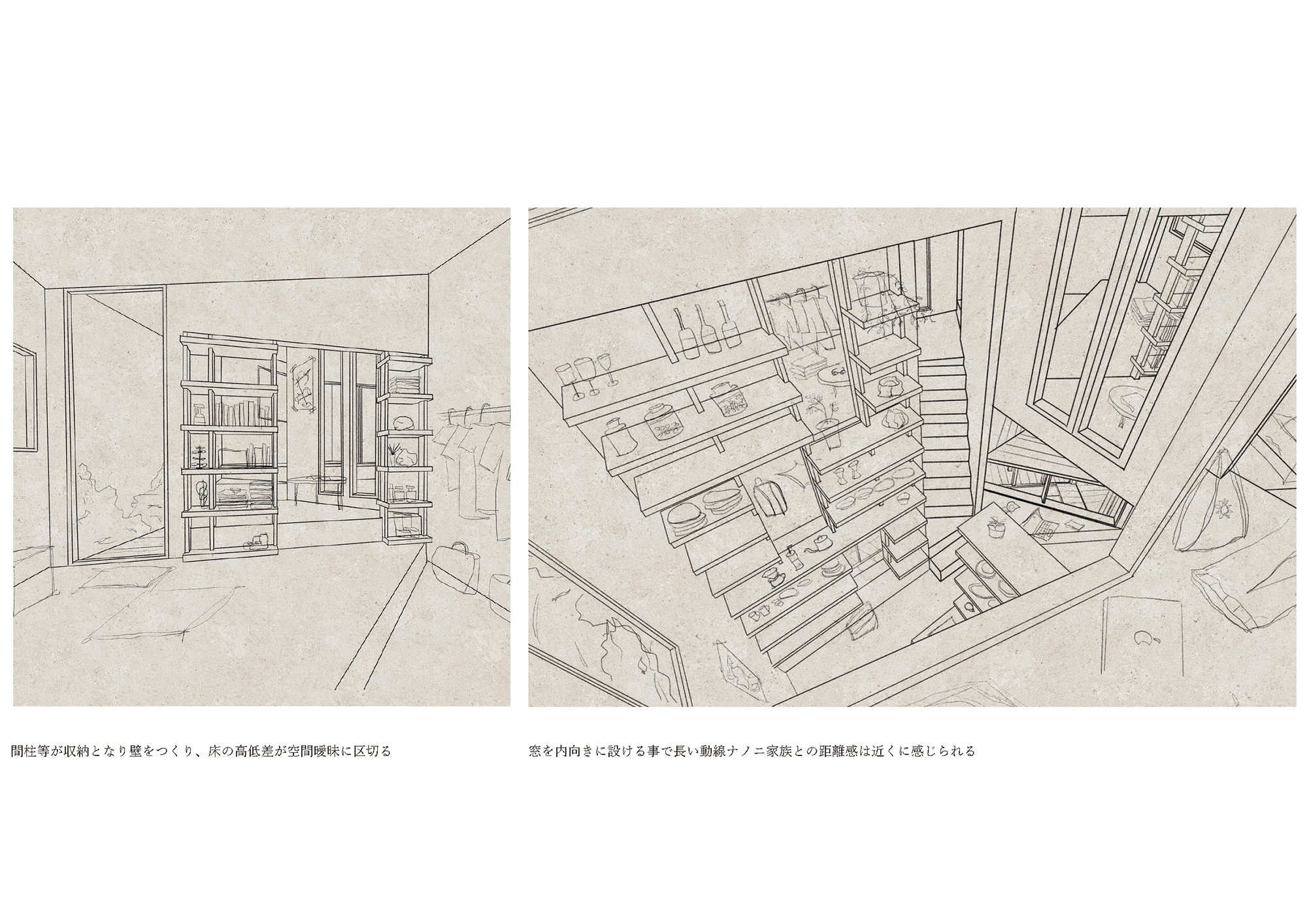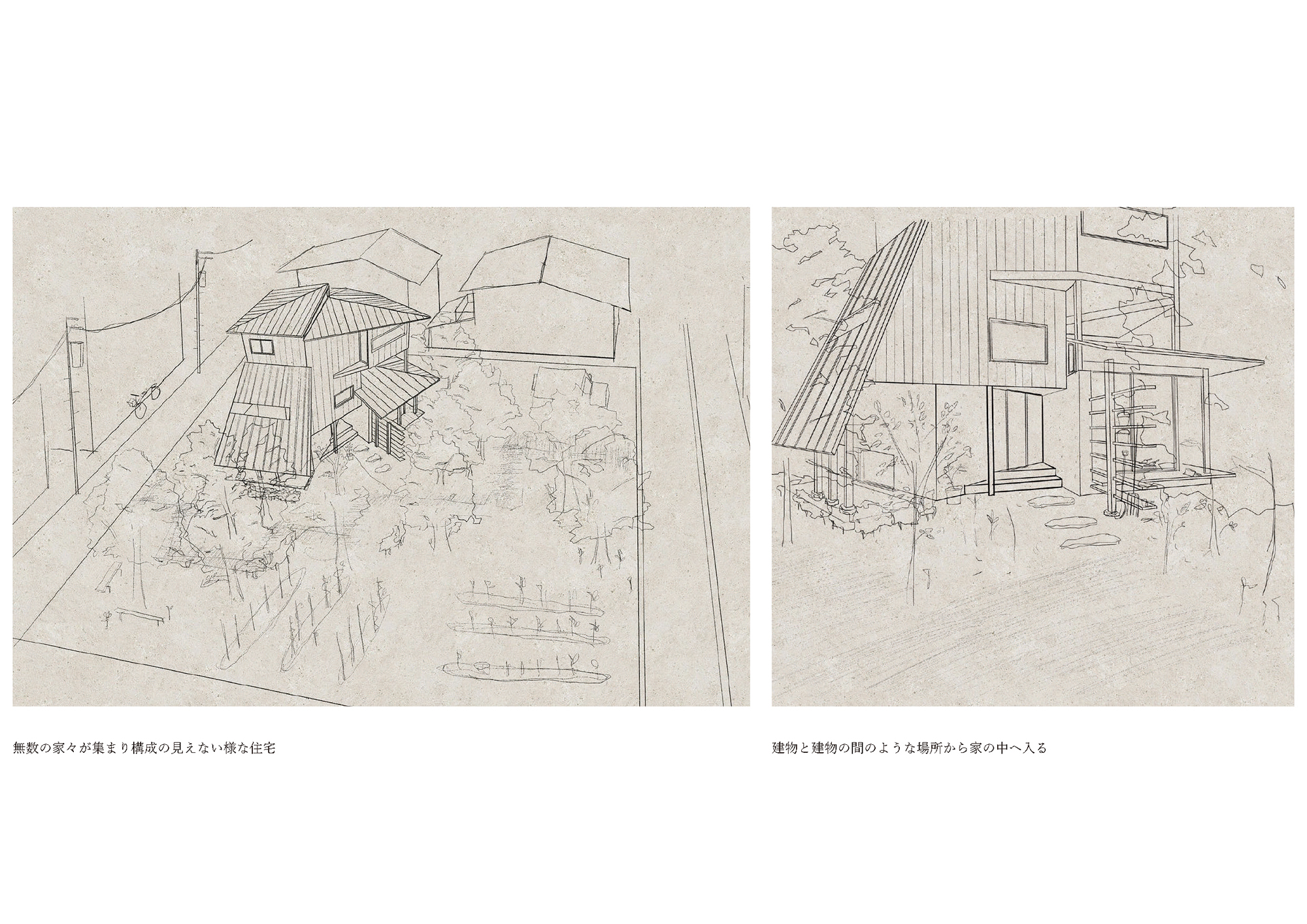 審査を終えて 阿曽 芙実 阿曽芙実築設計事務所 今年は、例年に比べると一次審査の提出物が軽いタッチで、内容を掴みきれないものが多く、評価しづらい印象であった。しかしながら、二次審査で選ばれた作品の発表を聞いていると、よく考えられていて、面白い作品がたくさんあった。 「ナノニ住宅」は、9坪を余すところなく使えていて、身体的な距離感が絶妙に描かれていました。欠点がないことが欠点と思わせるぐらい、完成度の高い作品になっていました。欲を言うとすると、屋根のかけ方を再考することで、既視感のないものにできるのではないかと思いました。 「暮らしと街のひととき」は、壁とスラブでさまざまな居場所を作りながらも、見事な回遊空間をつくり出していました。しかし、こちらも既視感が否めず、この場所にしかできない壁とスラブの並べ方や空間のつくり方、ここだからこの手法を使ったと言えるものがあるとより説得力のある作品になったと思います。 「道にすまう」は、一次審査では、内容が読み取りづらい印象でしたが、二次審査では、気づきの発端となった地域のシーンから説明されたので、よくわかりました。一次審査の資料にも、盛り込まれているとより良かったと思います。共用部の使われ方や、道としての礼儀みたいなものが、設計された建築の中でも、わかりやすく表現されていれば、もっとのめり込めたのではないかと思いました。 「舞台「 」」は、刺激的な建築で、こんな建築がどんな場所に建てば、より似合うのかなど、を審査が終わった後にも、ふと考えさせられる。とても印象的な建築でした。 他の入賞者の作品も、もう一歩踏み込んで、自分自身の「何故」「どうして」「モヤモヤする」を解決する糸口を建築に置き換えることをやってみることで、違う景色が見えてくる瞬間があるのではないかと思いました。 これから、またどこかで皆さんと建築の未来を話し合う機会を楽しみにしております。 河合 哲夫 株式会社竹中工務店 近畿学生住宅大賞は、今年で5回目となった。この5年間の出来事は、住宅設計を取り巻く環境に少なくない影響を与えた。パンデミックを契機に在宅勤務が広がるなど、行動様式の変化を引き起こした。地政学リスク等がもたらした資材価格やエネルギー価格の高騰は住宅事業を圧迫するだけでなく個人の生活志向にも変化をもたらしている。気候変動による影響は拡大し、人口減少と少子高齢化は続いている。家族観の変化も加速した感がある。これらを思いながら学生のみんなの住宅課題を見る5年間であった。 最優秀賞の川向世瞳さんによる「ナノニ住宅」は、わずか9坪ナノニ豊かな住まいをいかに生み出すかに挑む作品である。マルチユースな一室空間により面積上の課題を解決するのではなく、むしろその逆に細分化した空間を立体的に巡りながら生活することで、心理的な広がりを生み出そうという提案である。そのために個々のスペースは最小限となるのだが、機能的に成立するぎりぎりの空間を巧みに構成していく感性に惹かれた。 優秀賞の平出さつきさんの「暮らしと街のひととき」は、離散的に配置した壁と床により空間相互の関係に心地よい関係を作りながら一つの住宅を形作るという案。平面的にも断面的にも難解な空間構成だが、街と住宅内部、住宅の室と室の関係が検討されており、好ましい居心地を生み出すように考えられている。複雑な断面関係も、どうやらギリギリの高さ関係で成立させているようである。 もう一つの優秀賞となった楠部のどかさんによる「道にすまう」は、ランダムに配置した直方体をさらに不規則なスラブによって貫くことで生まれた空間を集合住宅として作り込むというユニークな提案である。この設計プロセスにどういう意義があるのかは、理解できたわけではない。しかし空間を形作る一つの方法として考え出し、やり抜いて見せた力量に可能性を感じた。 奨励賞の伊藤舞織さんの「舞台「 」」は、台形平面による四角錐の住宅で、その全体を膜で覆っている。内部の照明で浮かび上がる膜面に住民の影が映りこむ。その光景の魅力をプレゼンテーションすること一点に全力を注いでいる潔さが、他にはない力強さを感じさせた。 同じく奨励賞の有吉一騎さんの「次代の京都的くらしの手引き」は、多様な機能と建築が混在している京都の街の魅力に着目し、複合用途による開発を魅力あるまちづくりにつなげようとする案である。こうした開発を否定的に捉えて批判するのではなく、それを京都に馴染ませながらまちづくりに貢献するにはどうするべきかという現実的な課題に取り組んだようである。これが想定敷地の場所に相応しいとまでは思えなかったが、難しい課題に挑み、それをまとめ上げた力量を評価したいと思った。 もう一つの奨励賞である峠彩音さんの「みかん段の家」は、みかんを効率良く栽培するために形成された段々畑に着目し、その独特な地