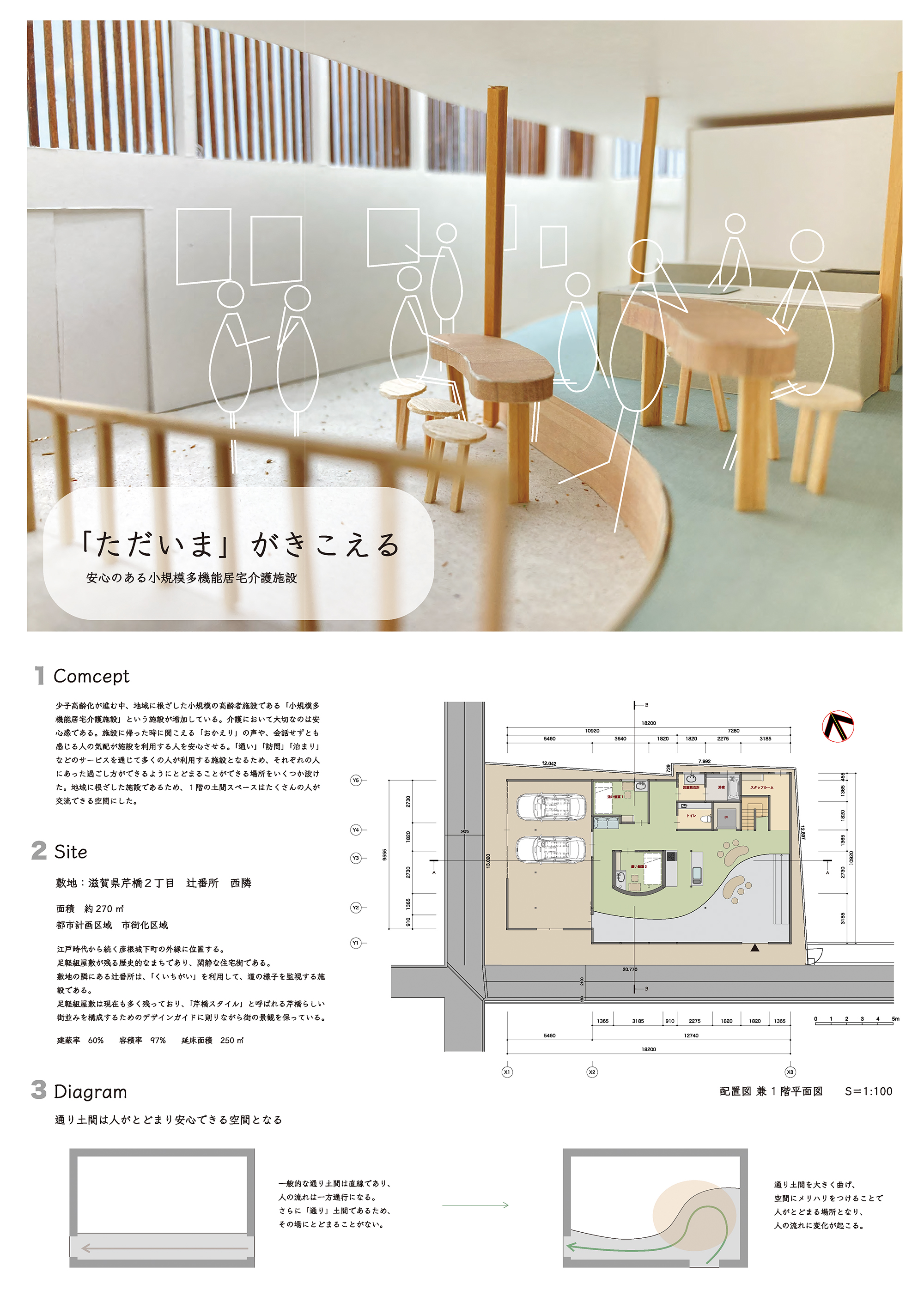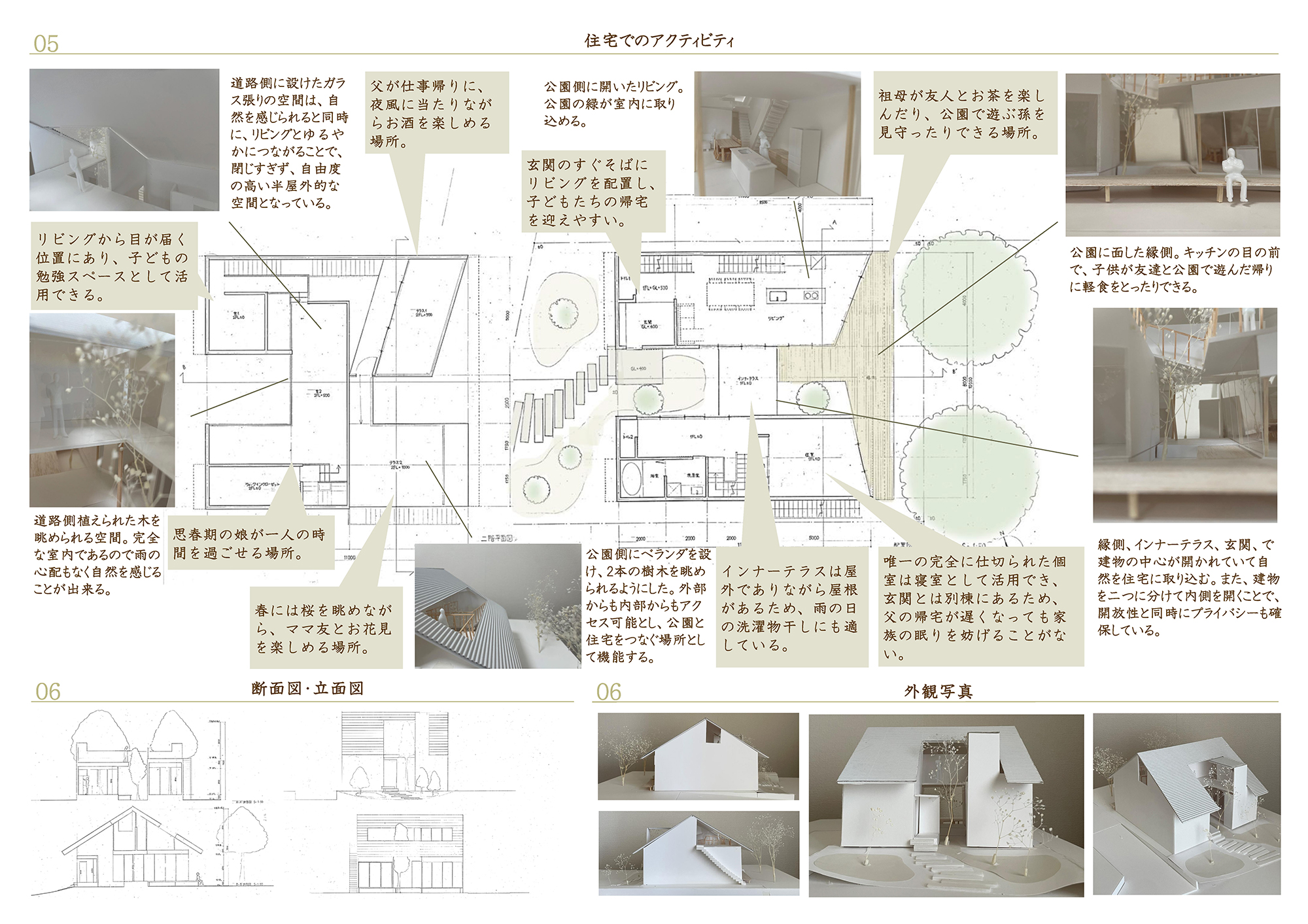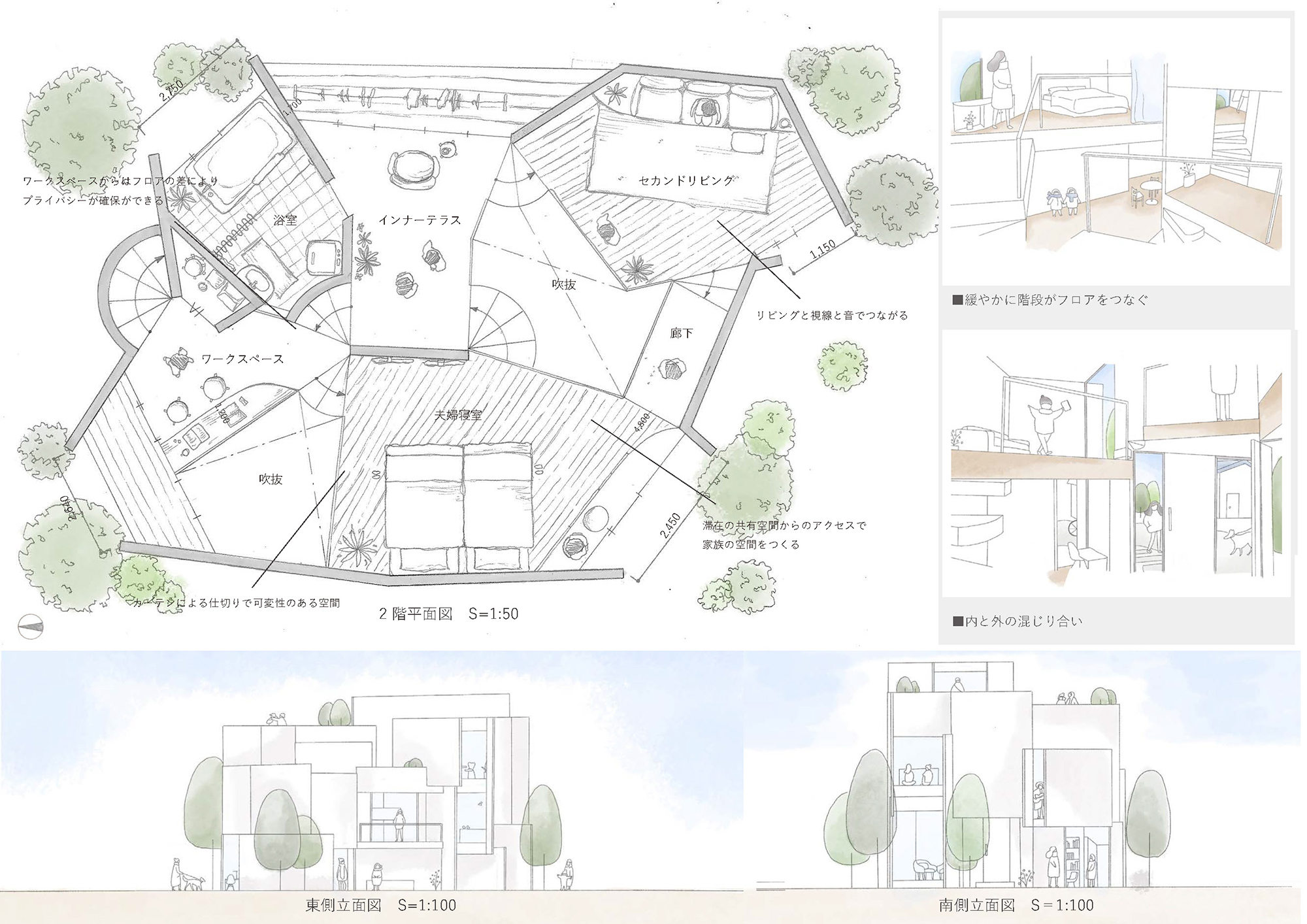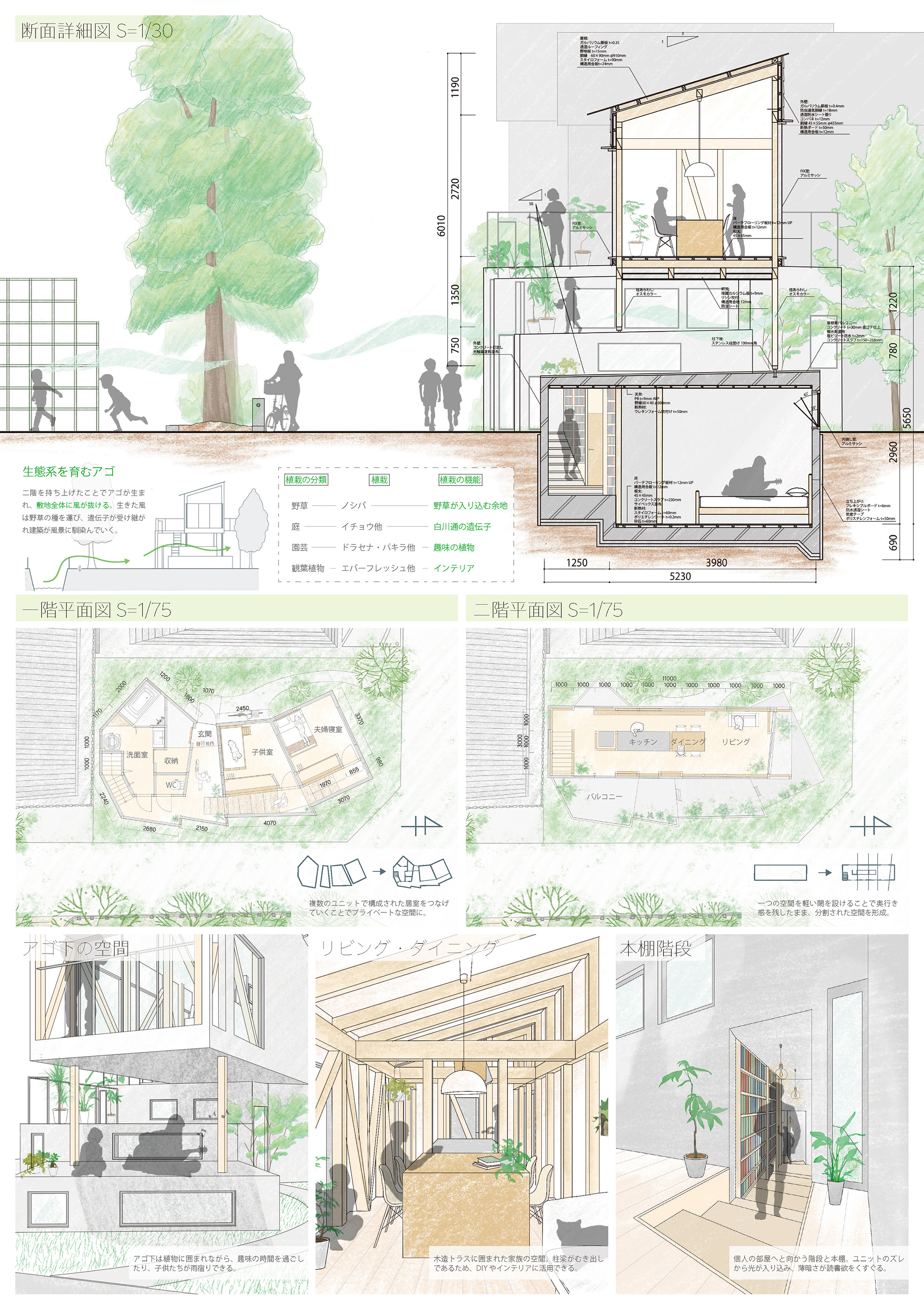 入賞作品以外では、シンプルで合理的な構成に内外の交流を促す仕掛けをさりげなく込めた大寺ちひろさんの「はみ出し、交わるくらし」、周辺の植生を丁寧に分析し詳細な設計へとまとめた竹内開偉さんの「アゴノアルイエ」も印象に残った。