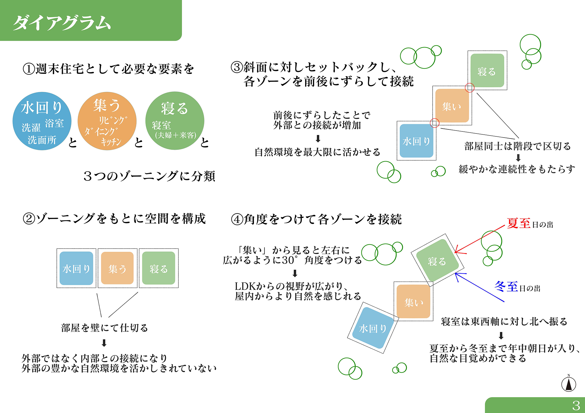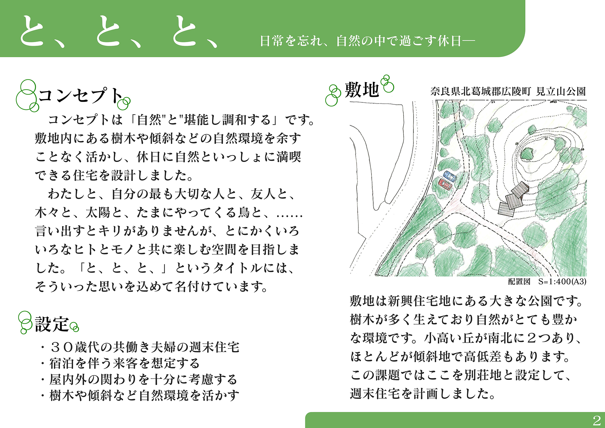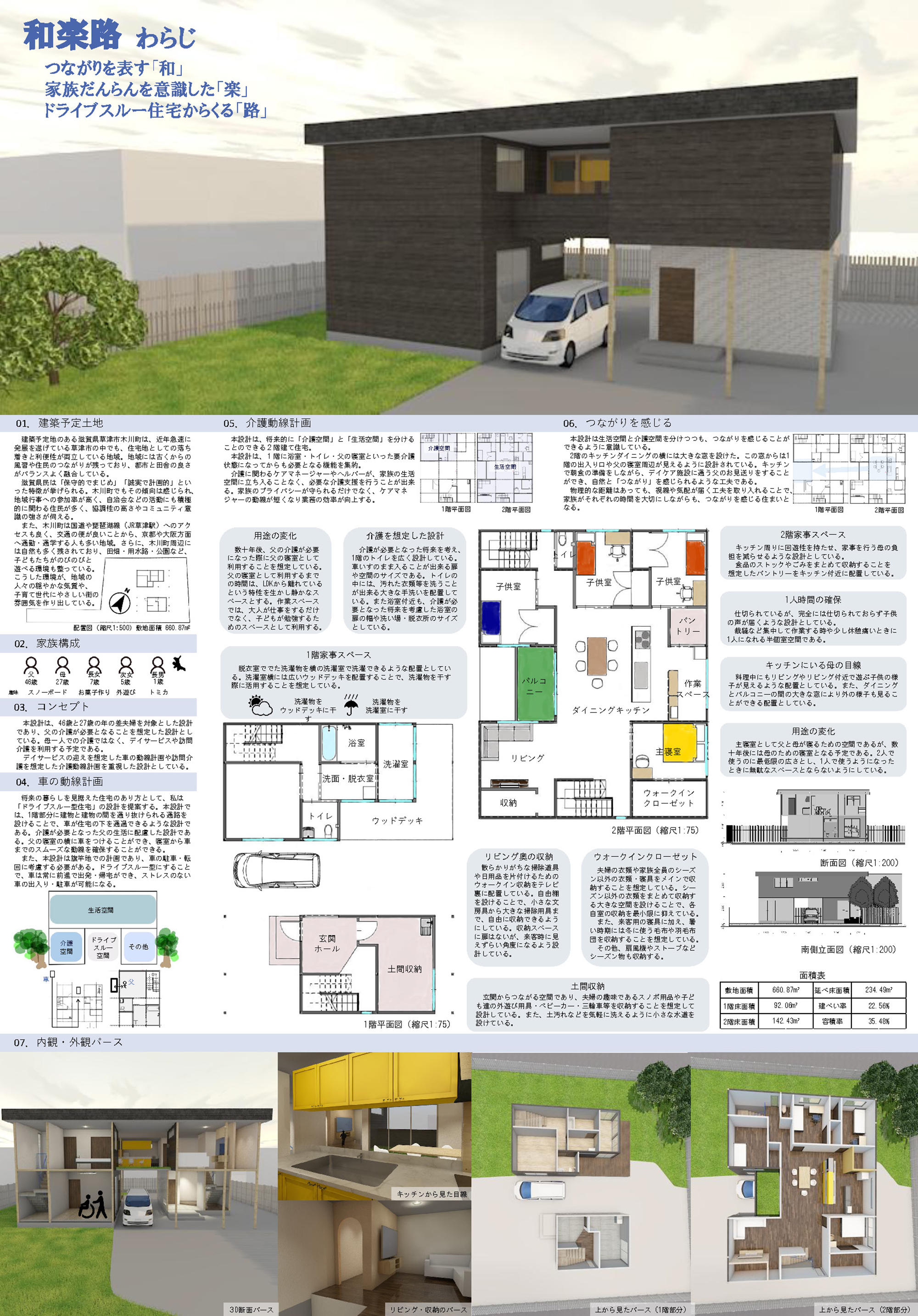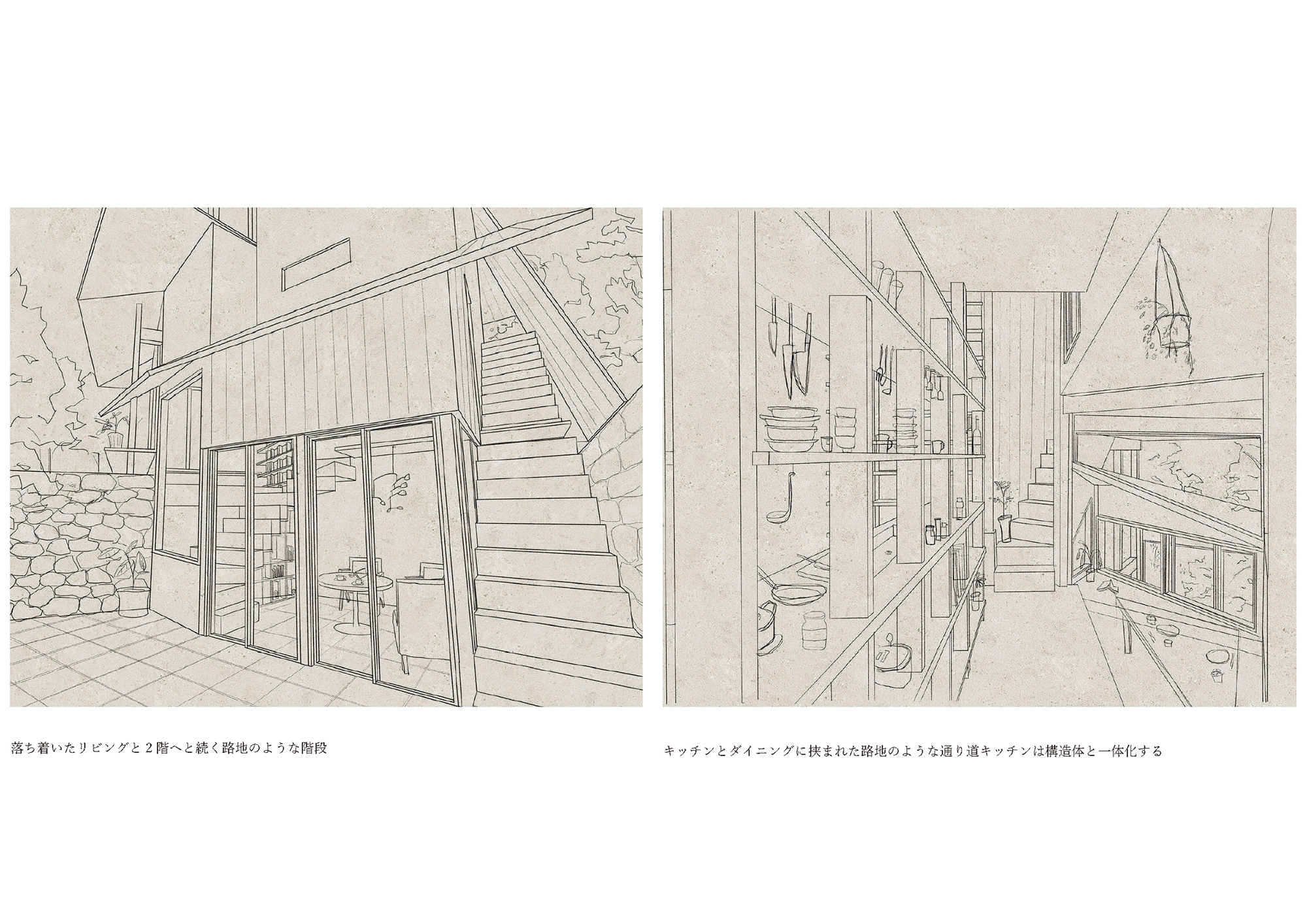 入賞作品以外では、シンプルで合理的な構成に内外の交流を促す仕掛けをさりげなく込めた大寺ちひろさんの「はみ出し、交わるくらし」、周辺の植生を丁寧に分析し詳細な設計へとまとめた竹内開偉さんの「アゴノアルイエ」も印象に残った。