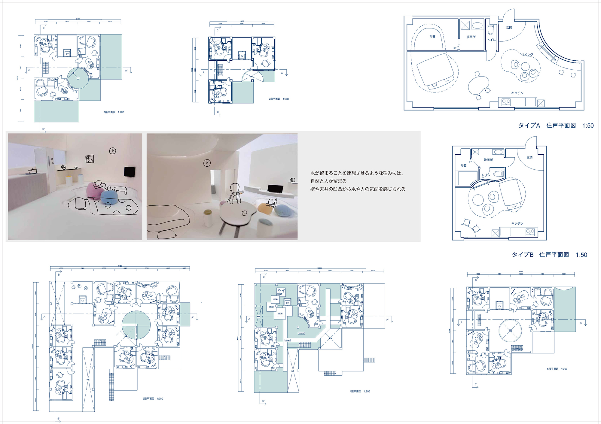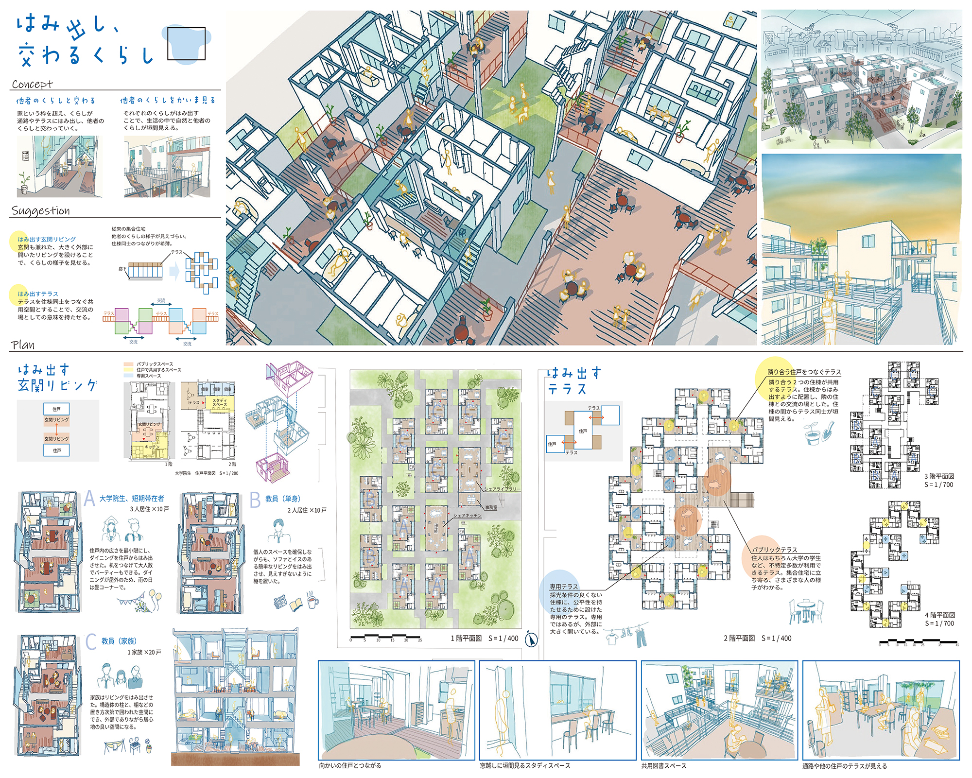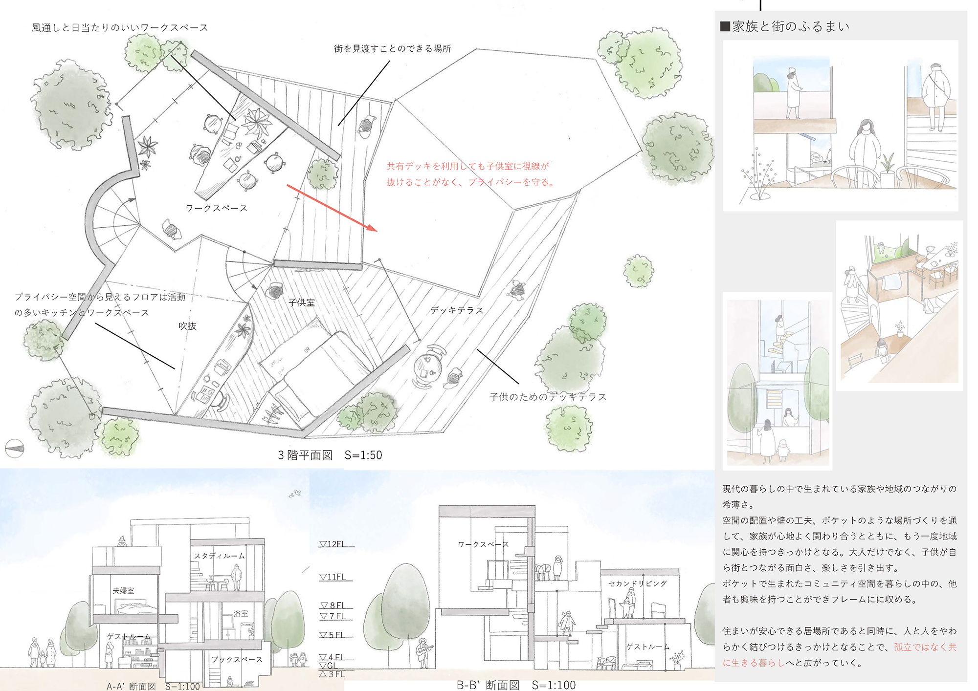 「道にすまう」は、一次審査では、内容が読み取りづらい印象でしたが、二次審査では、気づきの発端となった地域のシーンから説明されたので、よくわかりました。一次審査の資料にも、盛り込まれているとより良かったと思います。共用部の使われ方や、道としての礼儀みたいなものが、設計された建築の中でも、わかりやすく表現されていれば、もっとのめり込めたのではないかと思いました。
