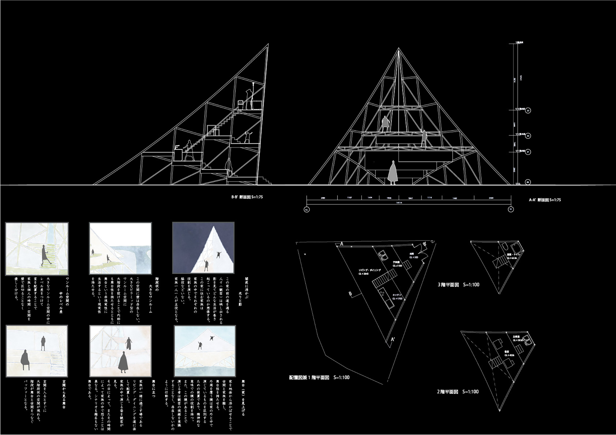 奨励賞の伊藤舞織さんの「舞台「 」」は、台形平面による四角錐の住宅で、その全体を膜で覆っている。内部の照明で浮かび上がる膜面に住民の影が映りこむ。その光景の魅力をプレゼンテーションすること一点に全力を注いでいる潔さが、他にはない力強さを感じさせた。