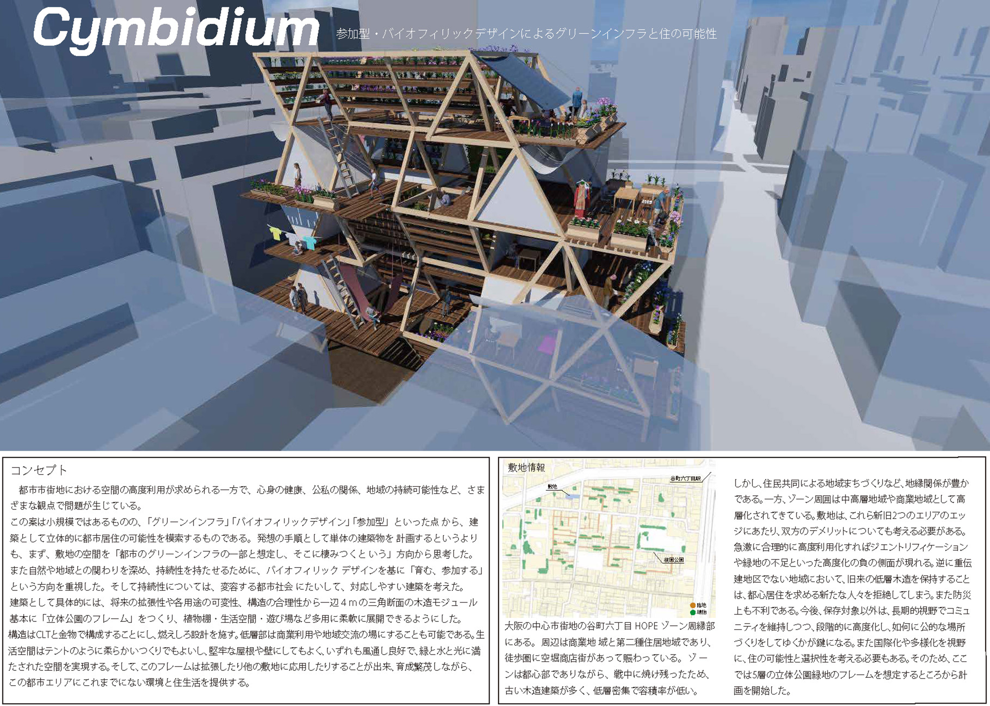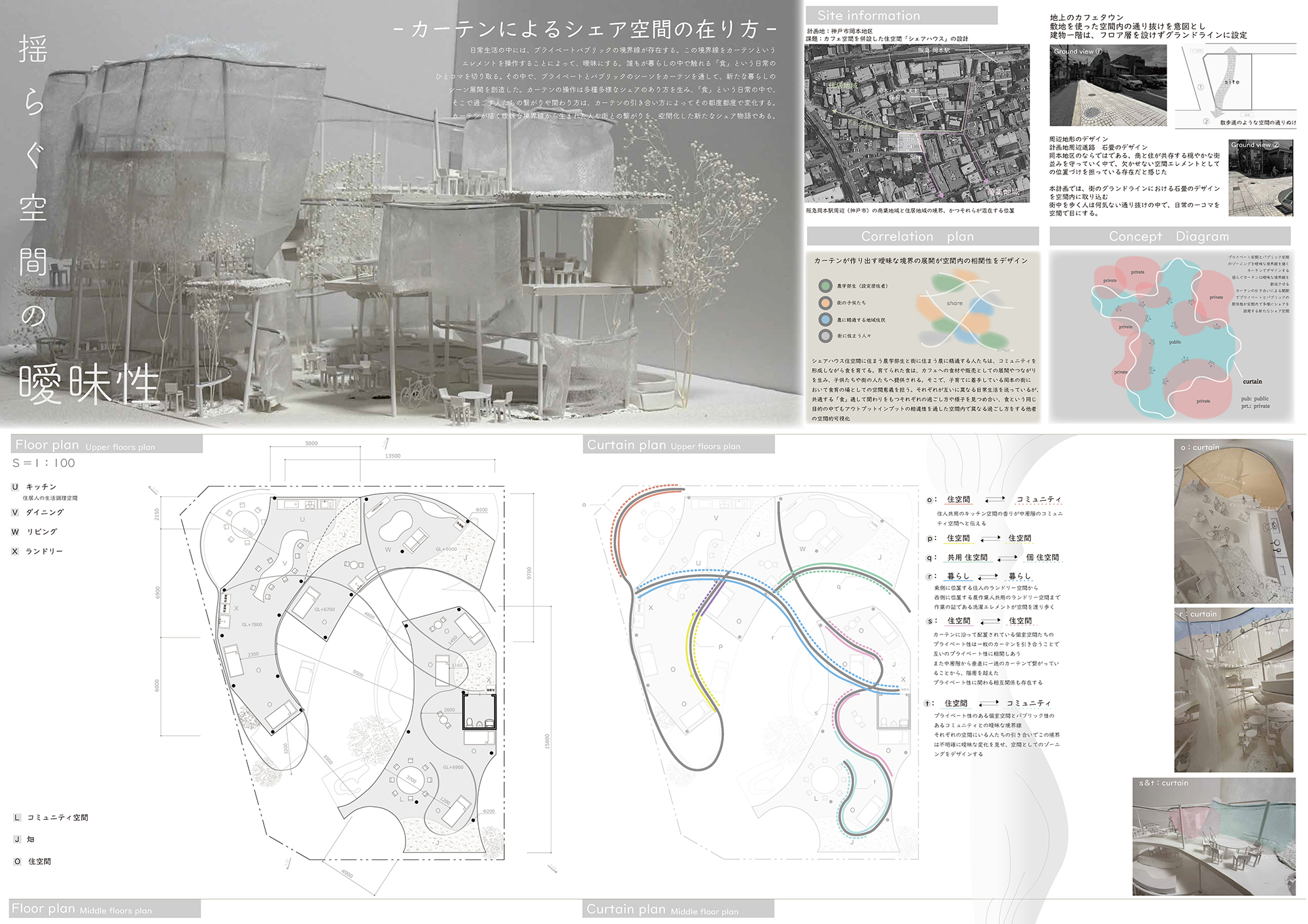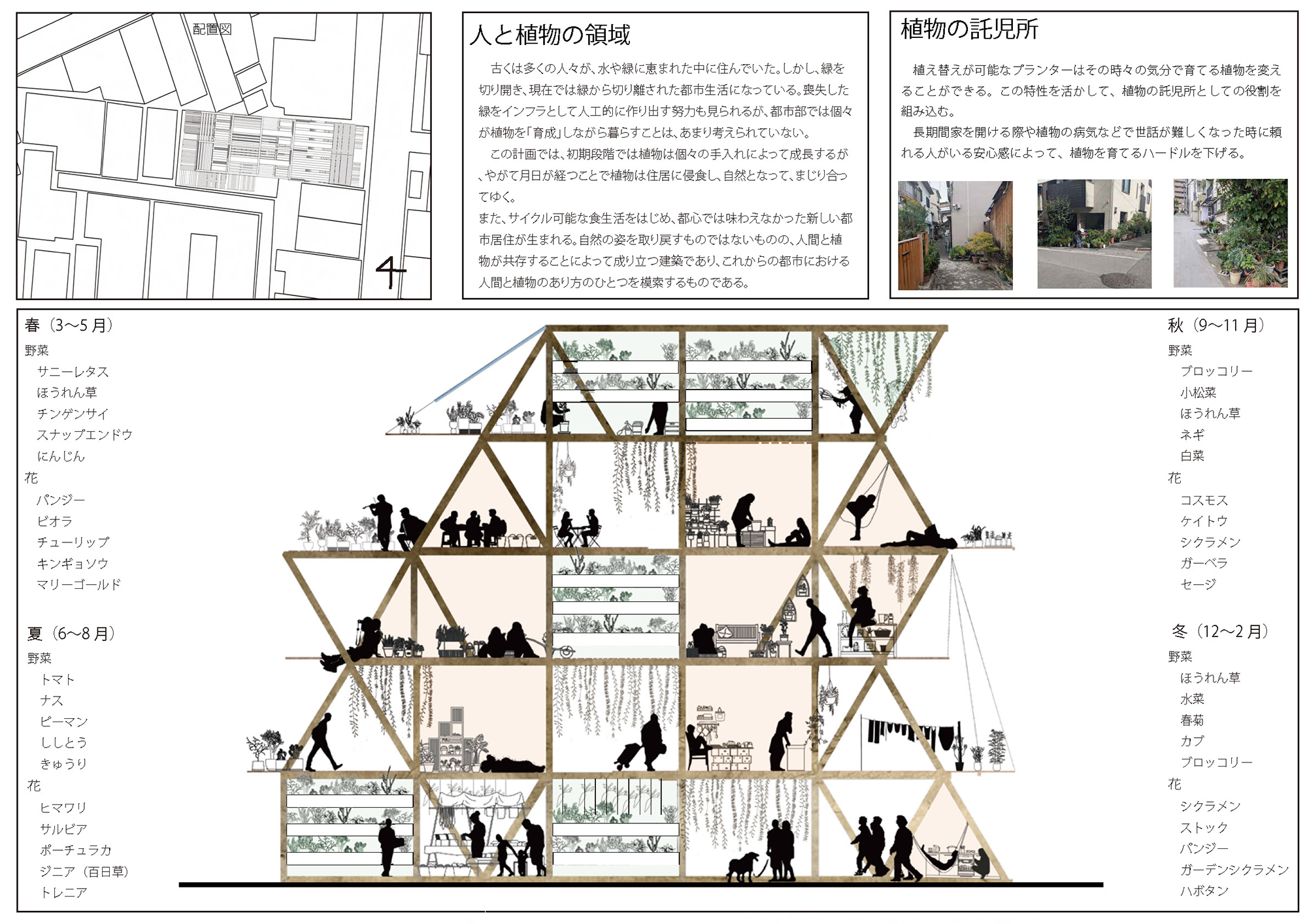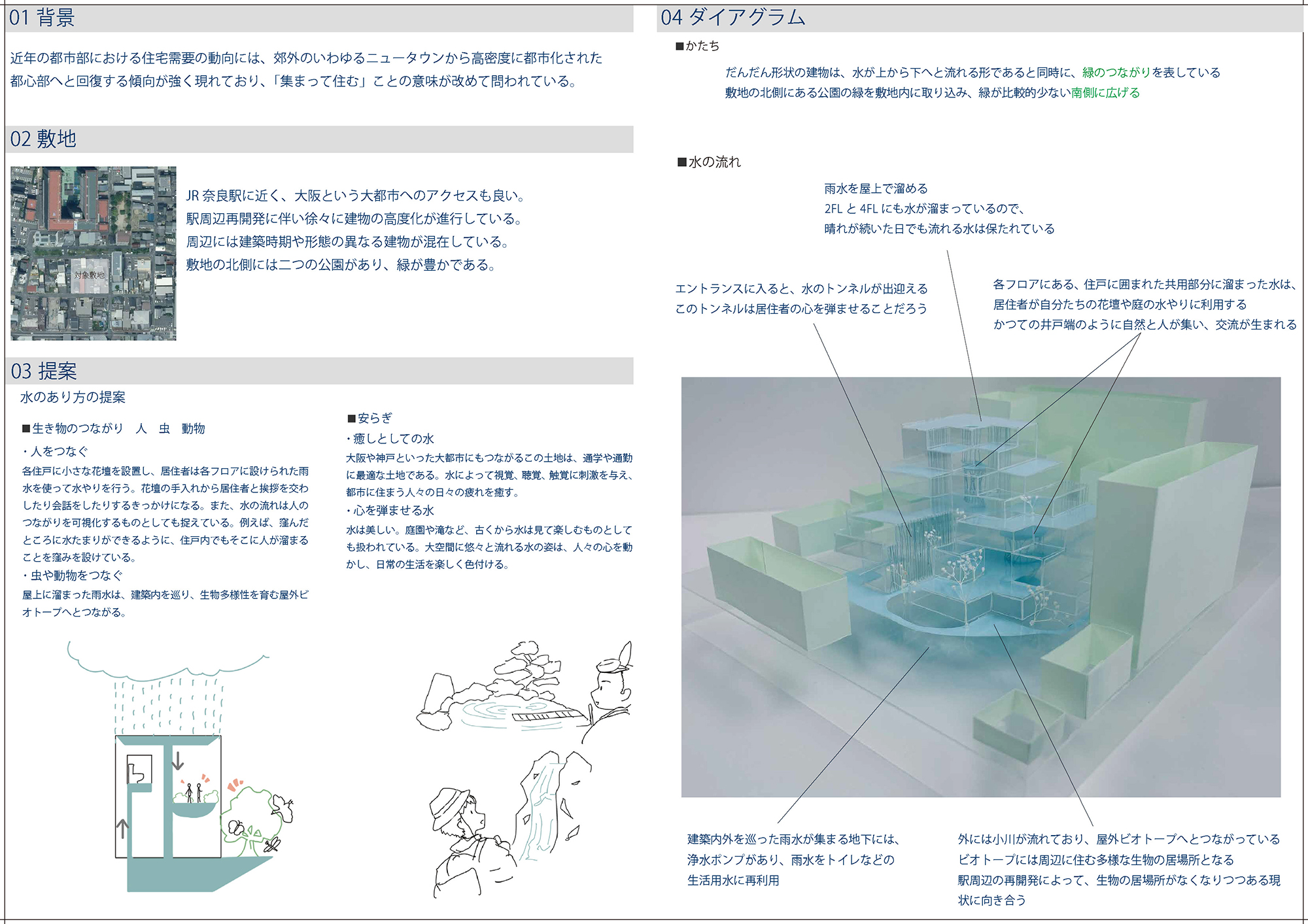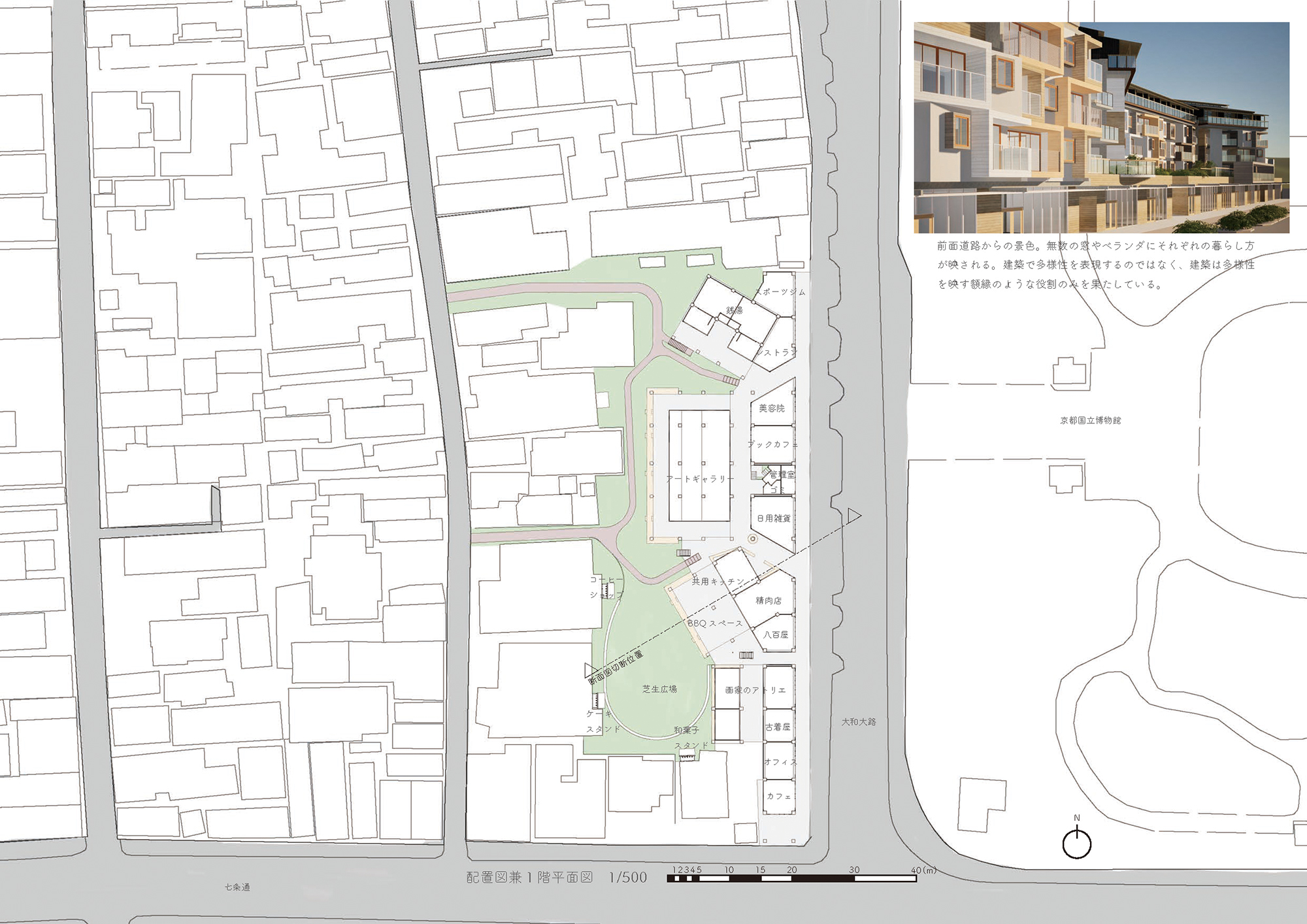 有吉一騎さんによる「次代の京都的くらしの手引き」は、街並みや政策を踏まえた現実的な提案に驚かされた。「多様性が京都の魅力」との分析に基づき、長い棟を折り曲げ、中庭や吹き抜けを織り込むことで、多様な要素を混ぜ合わせる複合的な集合住宅の提案だった。文章も明快で、「景観条例」や「補助金」といった現代京都の都市政策の事情を把握した上で自らの考えを建築に昇華した骨太な計画は高く評価できる。