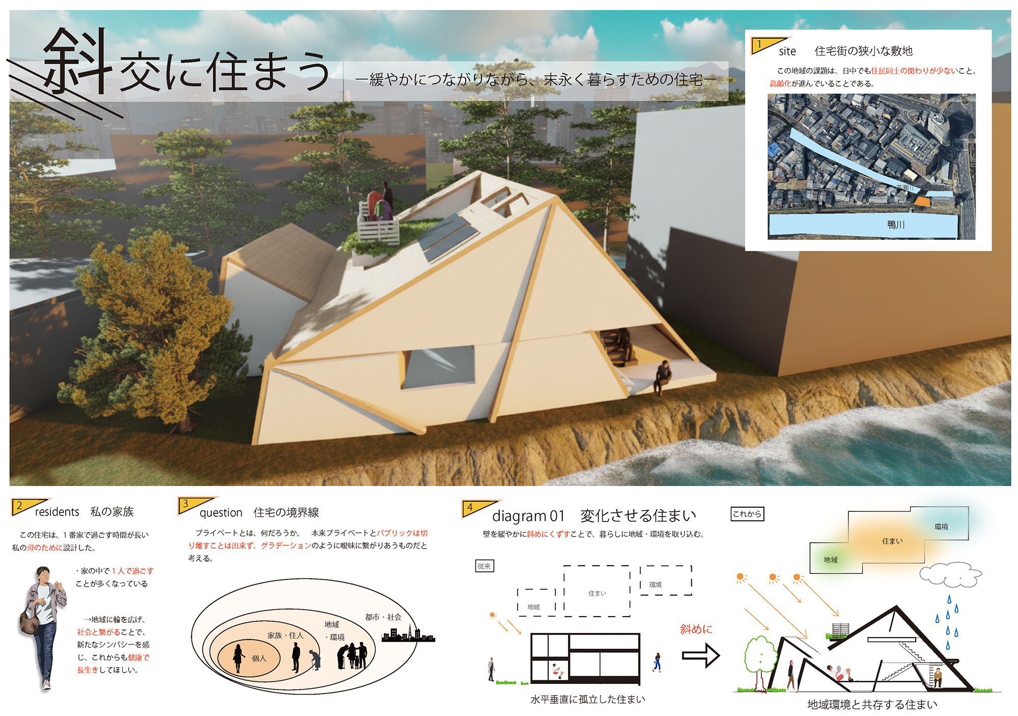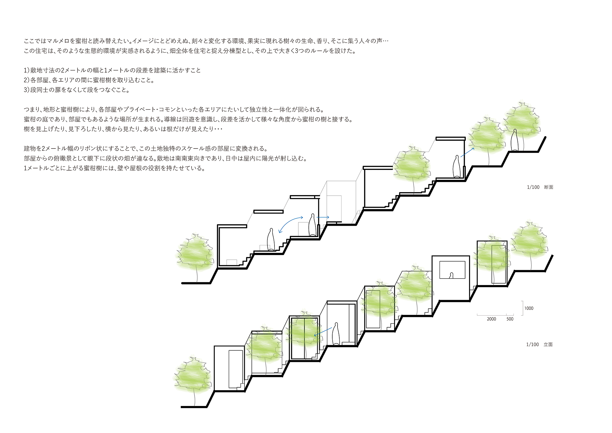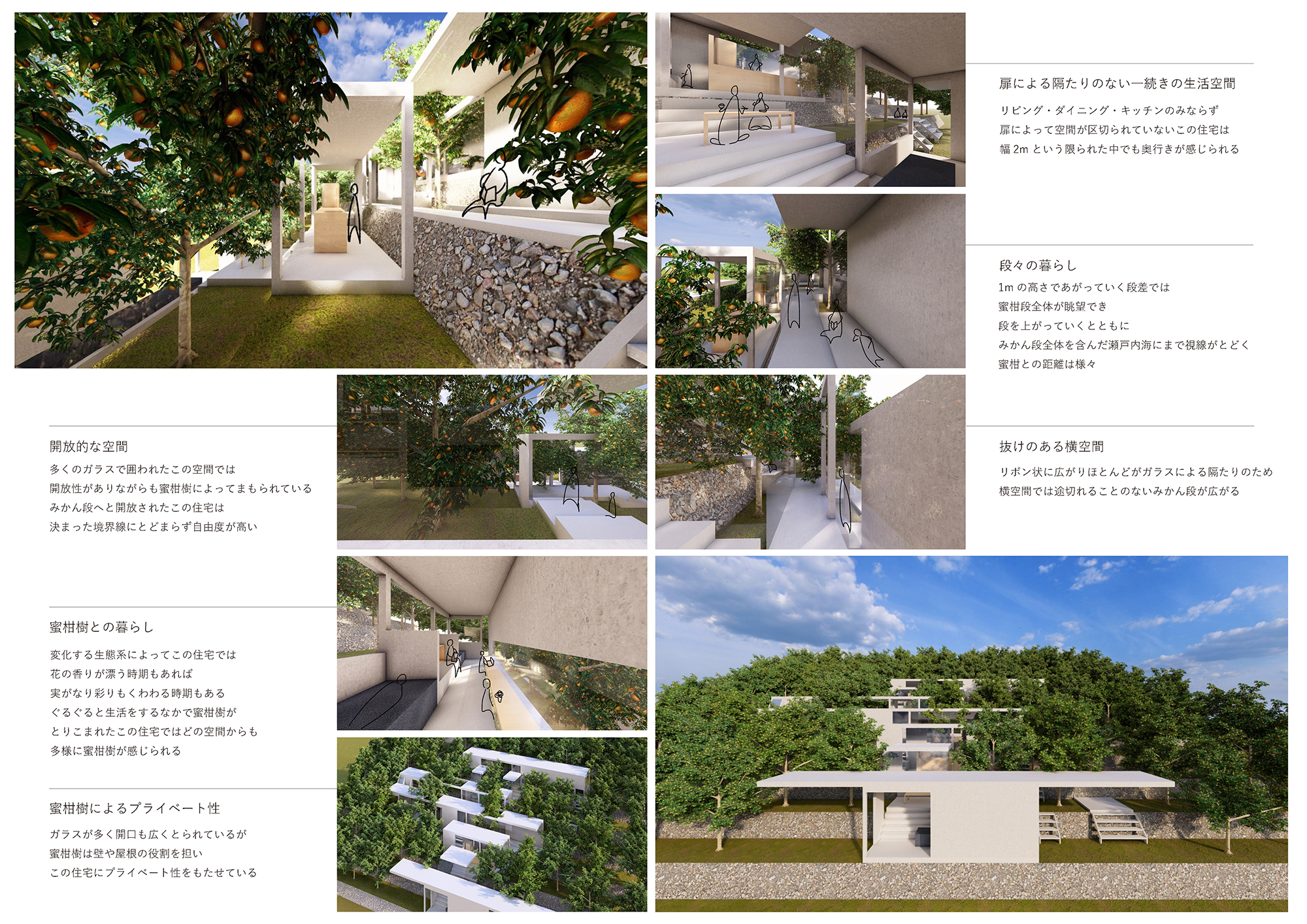 同じく奨励賞の有吉一騎さんの「次代の京都的くらしの手引き」は、多様な機能と建築が混在している京都の街の魅力に着目し、複合用途による開発を魅力あるまちづくりにつなげようとする案である。こうした開発を否定的に捉えて批判するのではなく、それを京都に馴染ませながらまちづくりに貢献するにはどうするべきかという現実的な課題に取り組んだようである。これが想定敷地の場所に相応しいとまでは思えなかったが、難しい課題に挑み、それをまとめ上げた力量を評価したいと思った。 もう一つの奨励賞である峠彩音さんの「みかん段の家」は、みかんを効率良く栽培するために形成された段々畑に着目し、その独特な地盤断面を生かして計画した住宅の提案である。周囲のみかん樹の生育を妨げないために決めたボリュームのおかげで、みかん畑と住宅との力関係が均衡するバランス感が心地よい。プランニングや造形をさらに洗練させていくと魅力が増すと思う。可能であれば時間をかけてスタディを継続してほしいと思わせる作品だった。
