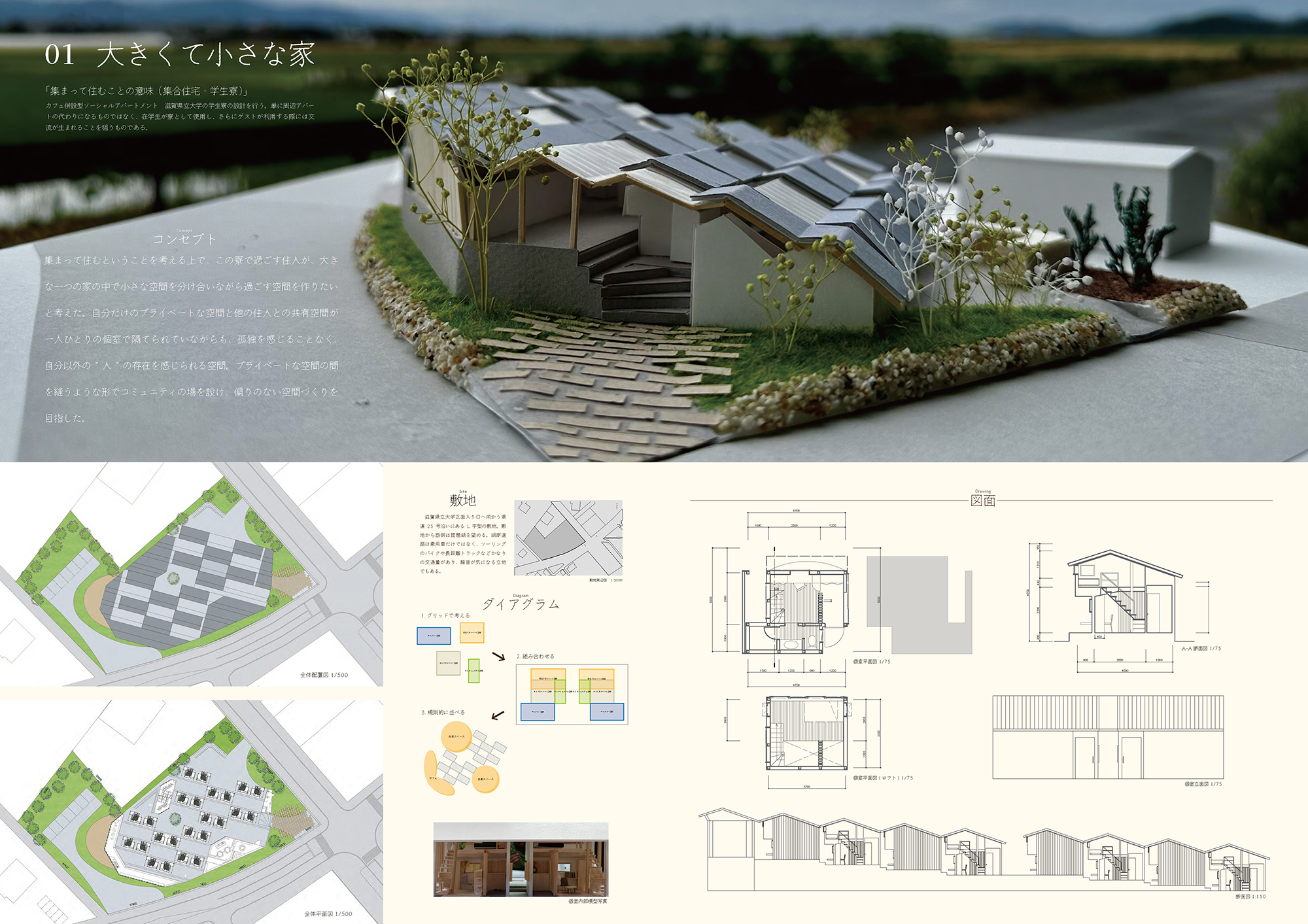 ほかにも、上空から捉えたような模型写真が美しかった峠彩音さんの「みかん段の家」、模型写真の引力が強かった小村菜々香さんの「大きくて小さな家」も心に残る。形式の可能性を信じてもっと詰めれば、さらに素晴らしい計画になっただろう。