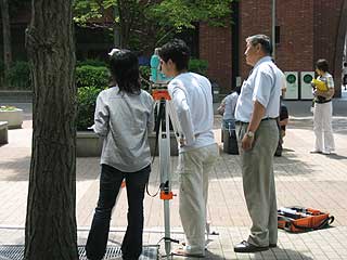 大学の構内では、偶然建築学科の学生がトランシット測量の実習中。学生時の記憶がよみがえります。