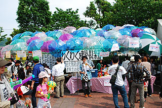 今年のテントデザインはSDG's。いらなくなったTシャツをエコバッグにしたものを屋根葺き材にして会場に「建築」をアピールしました