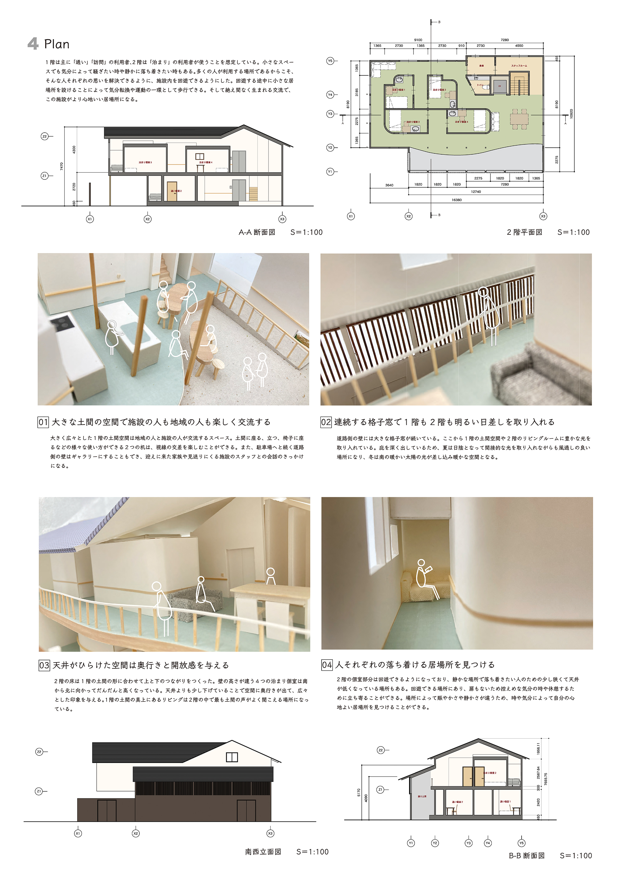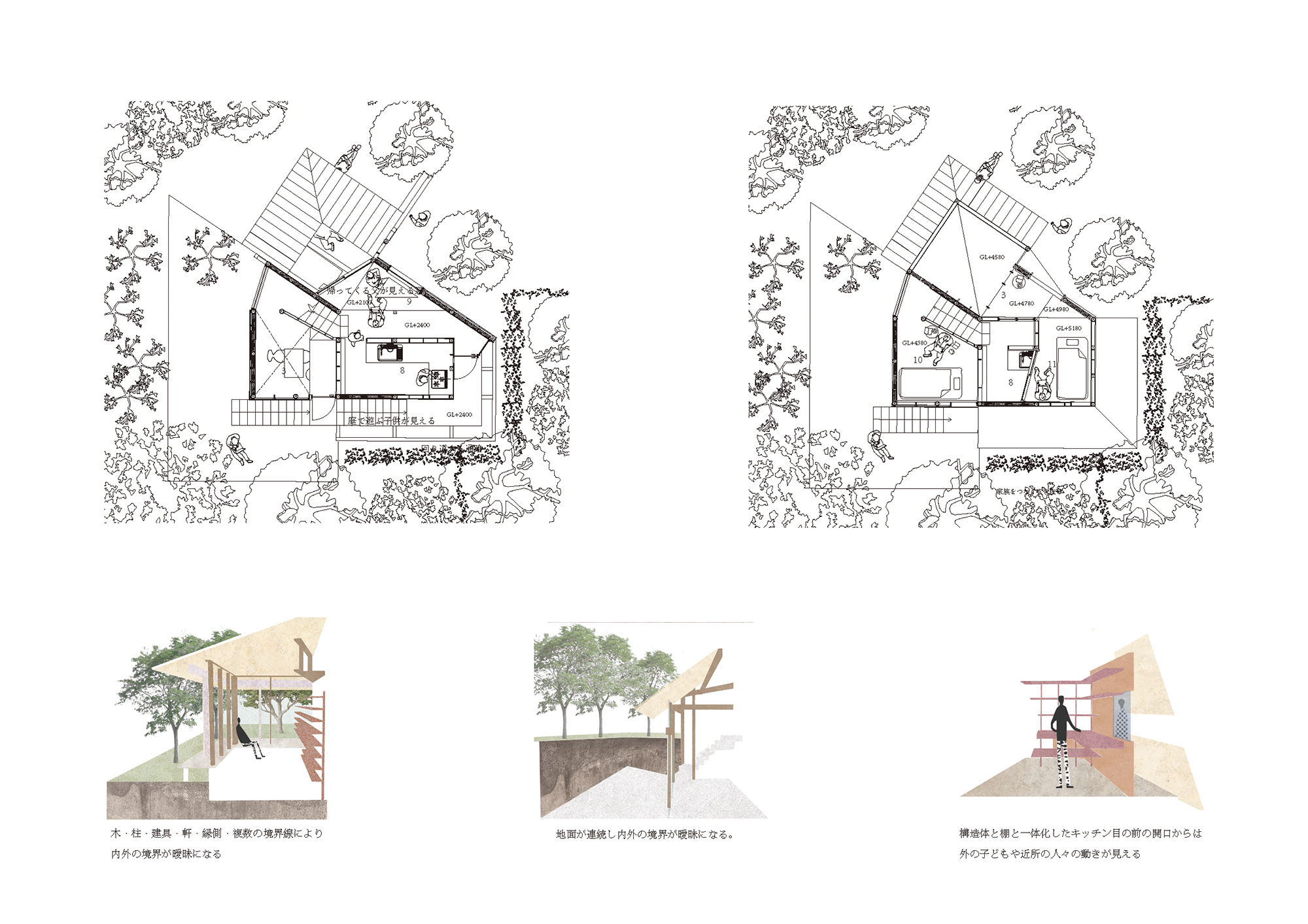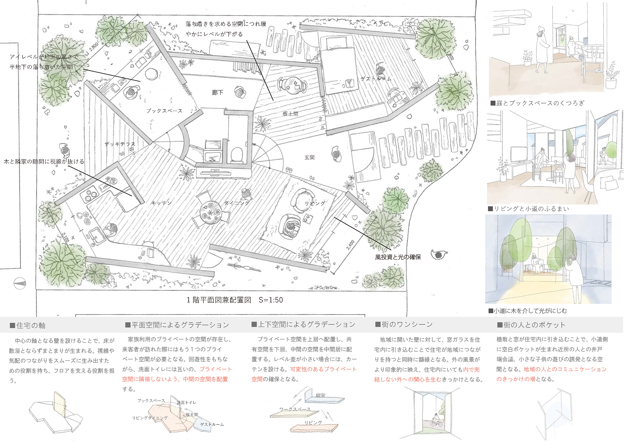 入賞作品以外では、シンプルで合理的な構成に内外の交流を促す仕掛けをさりげなく込めた大寺ちひろさんの「はみ出し、交わるくらし」、周辺の植生を丁寧に分析し詳細な設計へとまとめた竹内開偉さんの「アゴノアルイエ」も印象に残った。