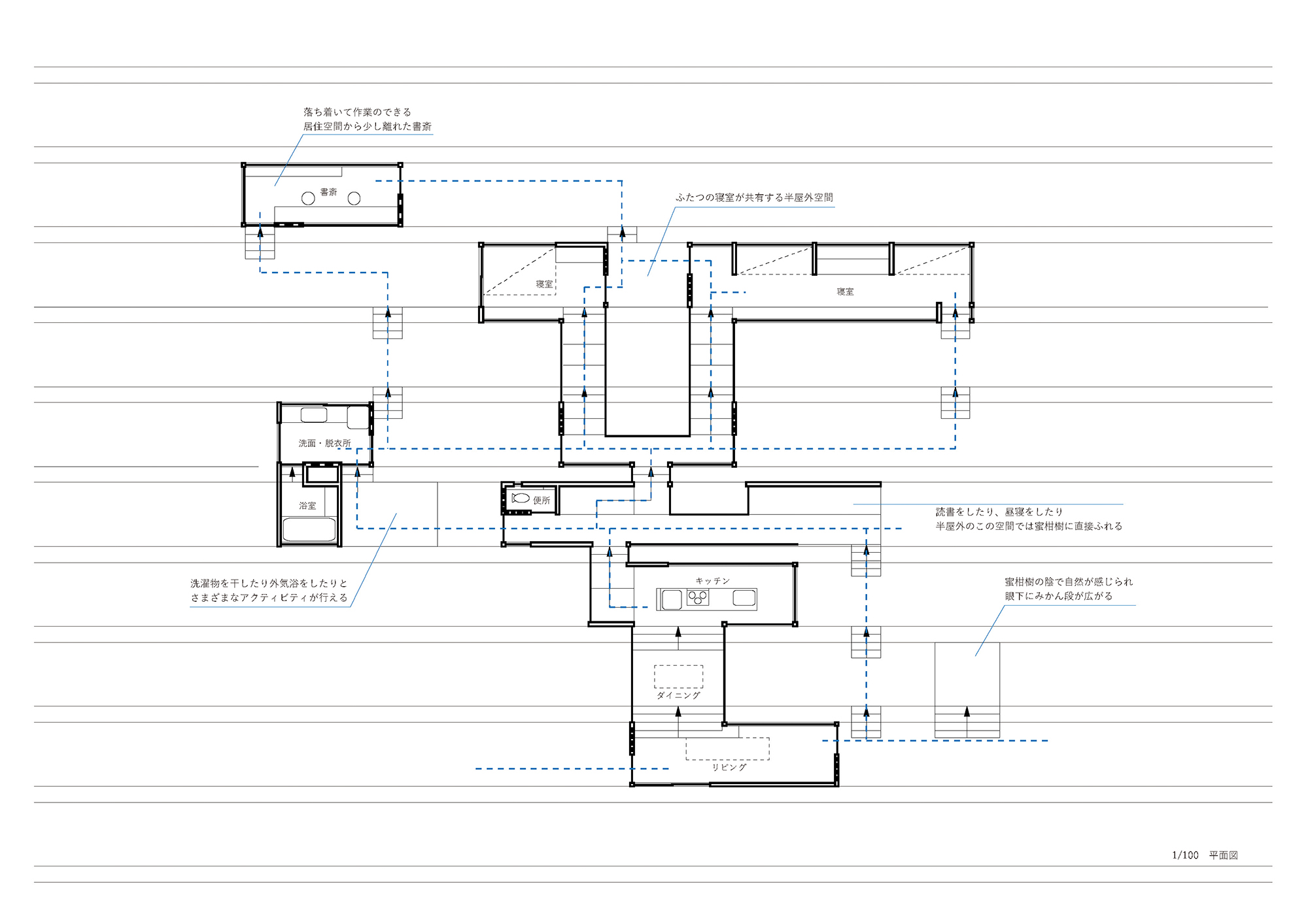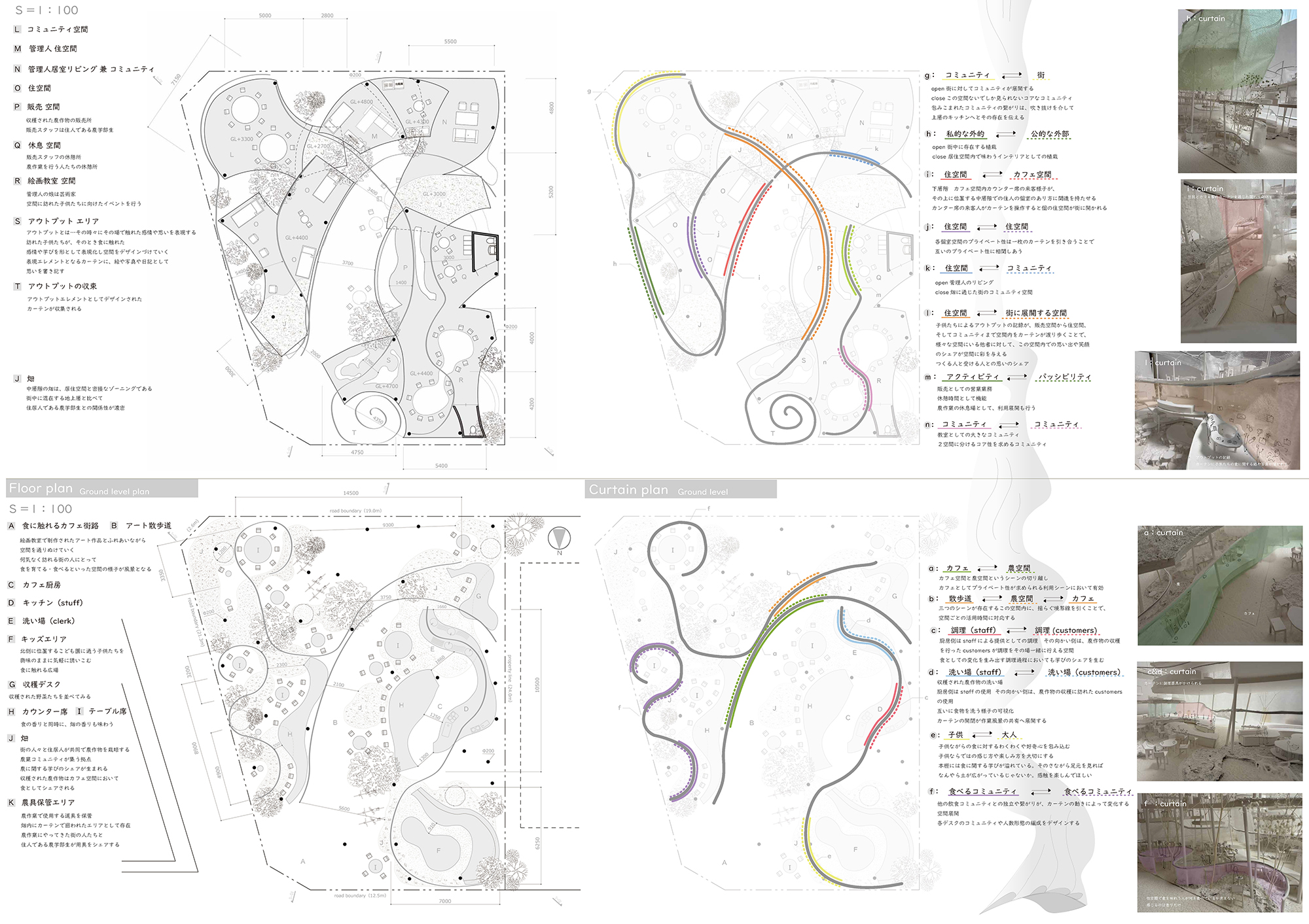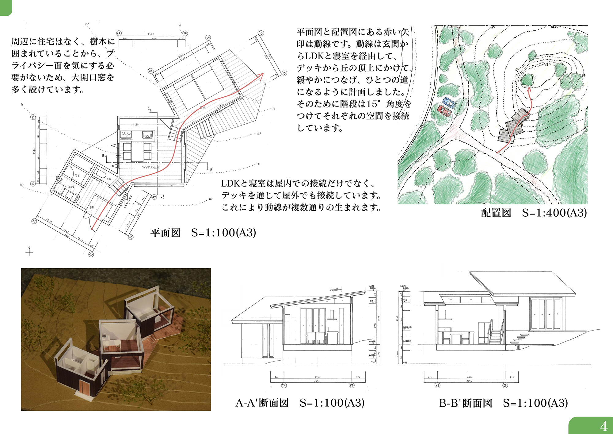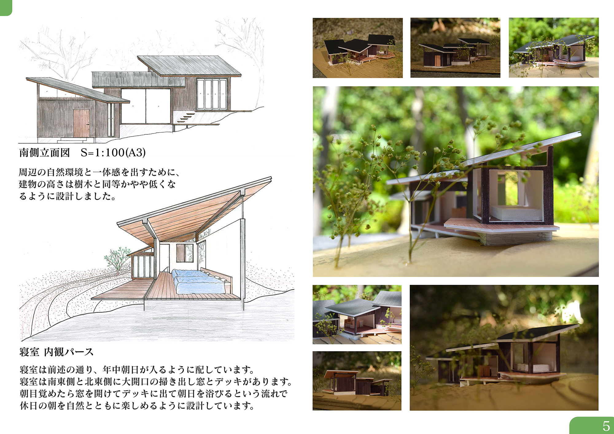 入賞作品以外では、シンプルで合理的な構成に内外の交流を促す仕掛けをさりげなく込めた大寺ちひろさんの「はみ出し、交わるくらし」、周辺の植生を丁寧に分析し詳細な設計へとまとめた竹内開偉さんの「アゴノアルイエ」も印象に残った。