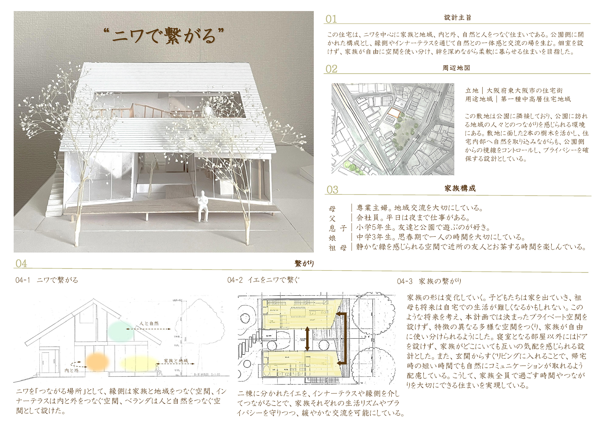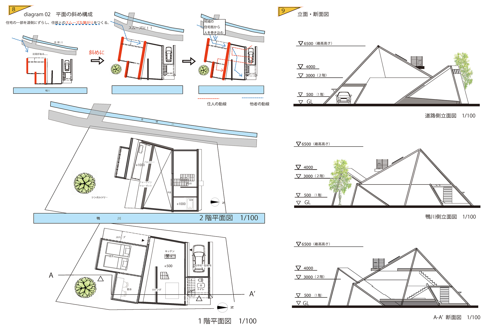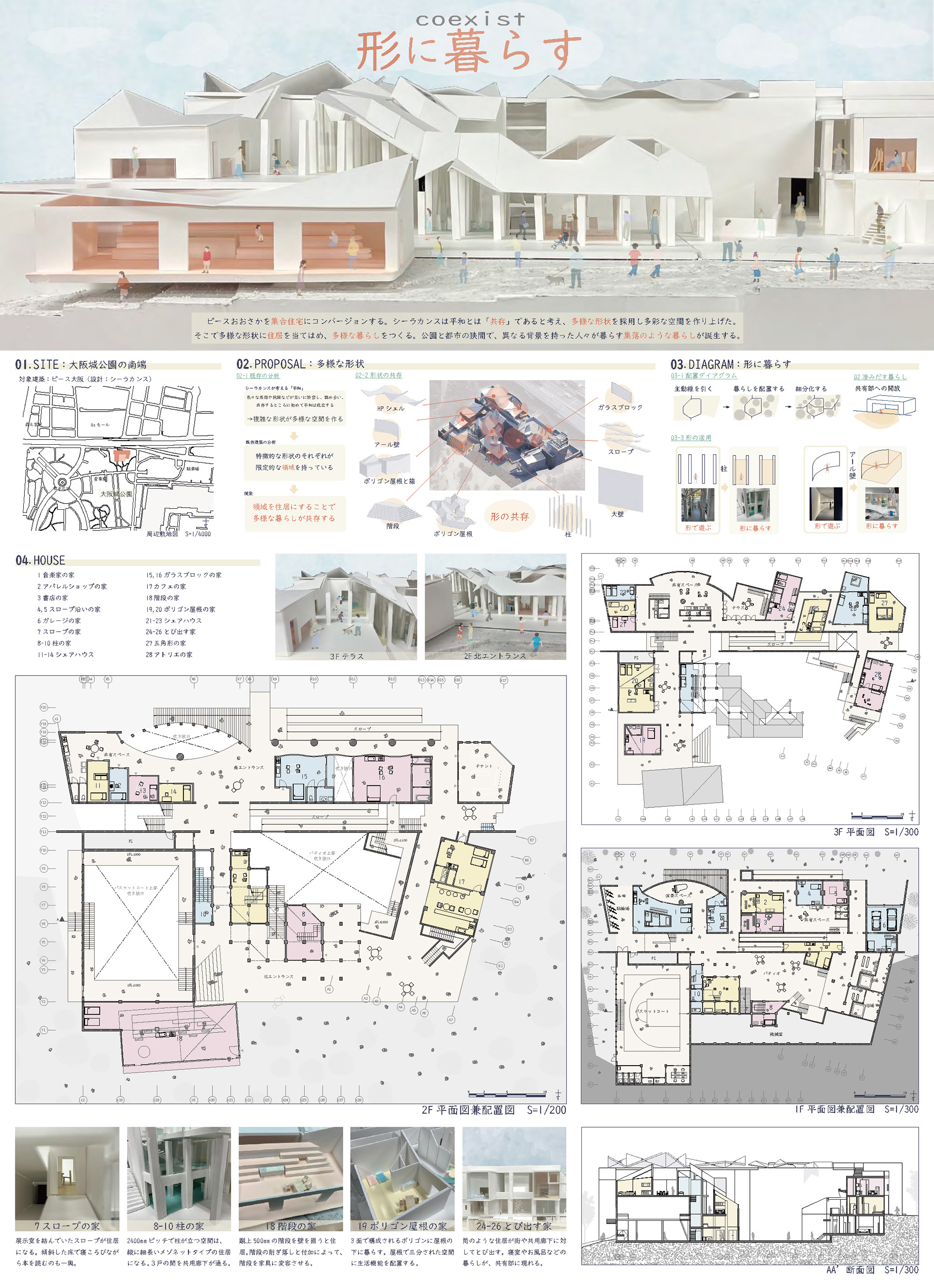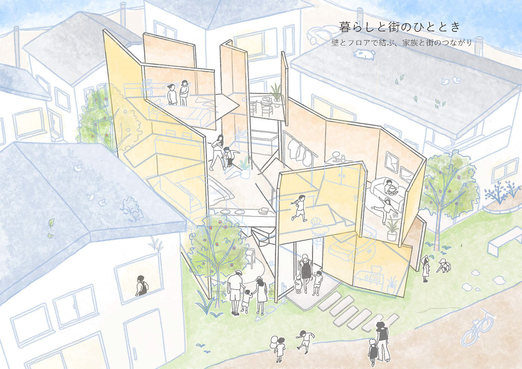 審査を終えて 阿曽 芙実 阿曽芙実築設計事務所 今年は、例年に比べると一次審査の提出物が軽いタッチで、内容を掴みきれないものが多く、評価しづらい印象であった。しかしながら、二次審査で選ばれた作品の発表を聞いていると、よく考えられていて、面白い作品がたくさんあった。 「ナノニ住宅」は、9坪を余すところなく使えていて、身体的な距離感が絶妙に描かれていました。欠点がないことが欠点と思わせるぐらい、完成度の高い作品になっていました。欲を言うとすると、屋根のかけ方を再考することで、既視感のないものにできるのではないかと思いました。 「暮らしと街のひととき」は、壁とスラブでさまざまな居場所を作りながらも、見事な回遊空間をつくり出していました。しかし、こちらも既視感が否めず、この場所にしかできない壁とスラブの並べ方や空間のつくり方、ここだからこの手法を使ったと言えるものがあるとより説得力のある作品になったと思います。 「道にすまう」は、一次審査では、内容が読み取りづらい印象でしたが、二次審査では、気づきの発端となった地域のシーンから説明されたので、よくわかりました。一次審査の資料にも、盛り込まれているとより良かったと思います。共用部の使われ方や、道としての礼儀みたいなものが、設計された建築の中でも、わかりやすく表現されていれば、もっとのめり込めたのではないかと思いました。 「舞台「 」」は、刺激的な建築で、こんな建築がどんな場所に建てば、より似合うのかなど、を審査が終わった後にも、ふと考えさせられる。とても印象的な建築でした。 他の入賞者の作品も、もう一歩踏み込んで、自分自身の「何故」「どうして」「モヤモヤする」を解決する糸口を建築に置き換えることをやってみることで、違う景色が見えてくる瞬間があるのではないかと思いました。 これから、またどこかで皆さんと建築の未来を話し合う機会を楽しみにしております。 河合 哲夫 株式会社竹中工務店 近畿学生住宅大賞は、今年で5回目となった。この5年間の出来事は、住宅設計を取り巻く環境に少なくない影響を与えた。パンデミックを契機に在宅勤務が広がるなど、行動様式の変化を引き起こした。地政学リスク等がもたらした資材価格やエネルギー価格の高騰は住宅事業を圧迫するだけでなく個人の生活志向にも変化をもたらしている。気候変動による影響は拡大し、人口減少と少子高齢化は続いている。家族観の変化も加速した感がある。これらを思いながら学生のみんなの住宅課題を見る5年間であった。 最優秀賞の川向世瞳さんによる「ナノニ住宅」は、わずか9坪ナノニ豊かな住まいをいかに生み出すかに挑む作品である。マルチユースな一室空間により面積上の課題を解決するのではなく、むしろその逆に細分化した空間を立体的に巡りながら生活することで、心理的な広がりを生み出そうという提案である。そのために個々のスペースは最小限となるのだが、機能的に成立するぎりぎりの空間を巧みに構成していく感性に惹かれた。 優秀賞の平出さつきさんの「暮らしと街のひととき」は、離散的に配置した壁と床により空間相互の関係に心地よい関係を作りながら一つの住宅を形作るという案。平面的にも断面的にも難解な空間構成だが、街と住宅内部、住宅の室と室の関係が検討されており、好ましい居心地を生み出すように考えられている。複雑な断面関係も、どうやらギリギリの高さ関係で成立させているようである。 もう一つの優秀賞となった楠部のどかさんによる「道にすまう」は、ランダムに配置した直方体をさらに不規則なスラブによって貫くことで生まれた空間を集合住宅として作り込むというユニークな提案である。この設計プロセスにどういう意義があるのかは、理解できたわけではない。しかし空間を形作る一つの方法として考え出し、やり抜いて見せた力量に可能性を感じた。 奨励賞の伊藤舞織さんの「舞台「 」」は、台形平面による四角錐の住宅で、その全体を膜で覆っている。内部の照明で浮かび上がる膜面に住民の影が映りこむ。その光景の魅力をプレゼンテーションすること一点に全力を注いでいる潔さが、他にはない力強さを感じさせた。 同じく奨励賞の有吉一騎さんの「次代の京都的くらしの手引き」は、多様な機能と建築が混在している京都の街の魅力に着目し、複合用途による開発を魅力あるまちづくりにつなげようとする案である。こうした開発を否定的に捉えて批判するのではなく、それを京都に馴染ませながらまちづくりに貢献するにはどうするべきかという現実的な課題に取り組んだようである。これが想定敷地の場所に相応しいとまでは思えなかったが、難しい課題に挑み、それをまとめ上げた力量を評価したいと思った。 もう一つの奨励賞である峠彩音さんの「みかん段の家」は、みかんを効率良く栽培するために形成された段々畑に着目し、その独特な地