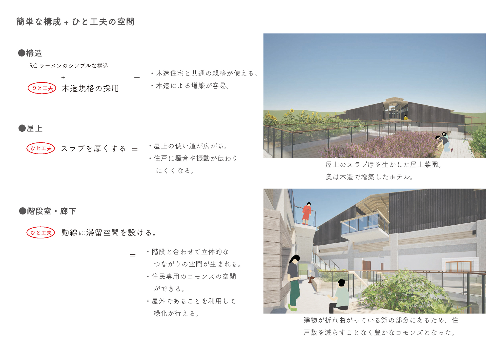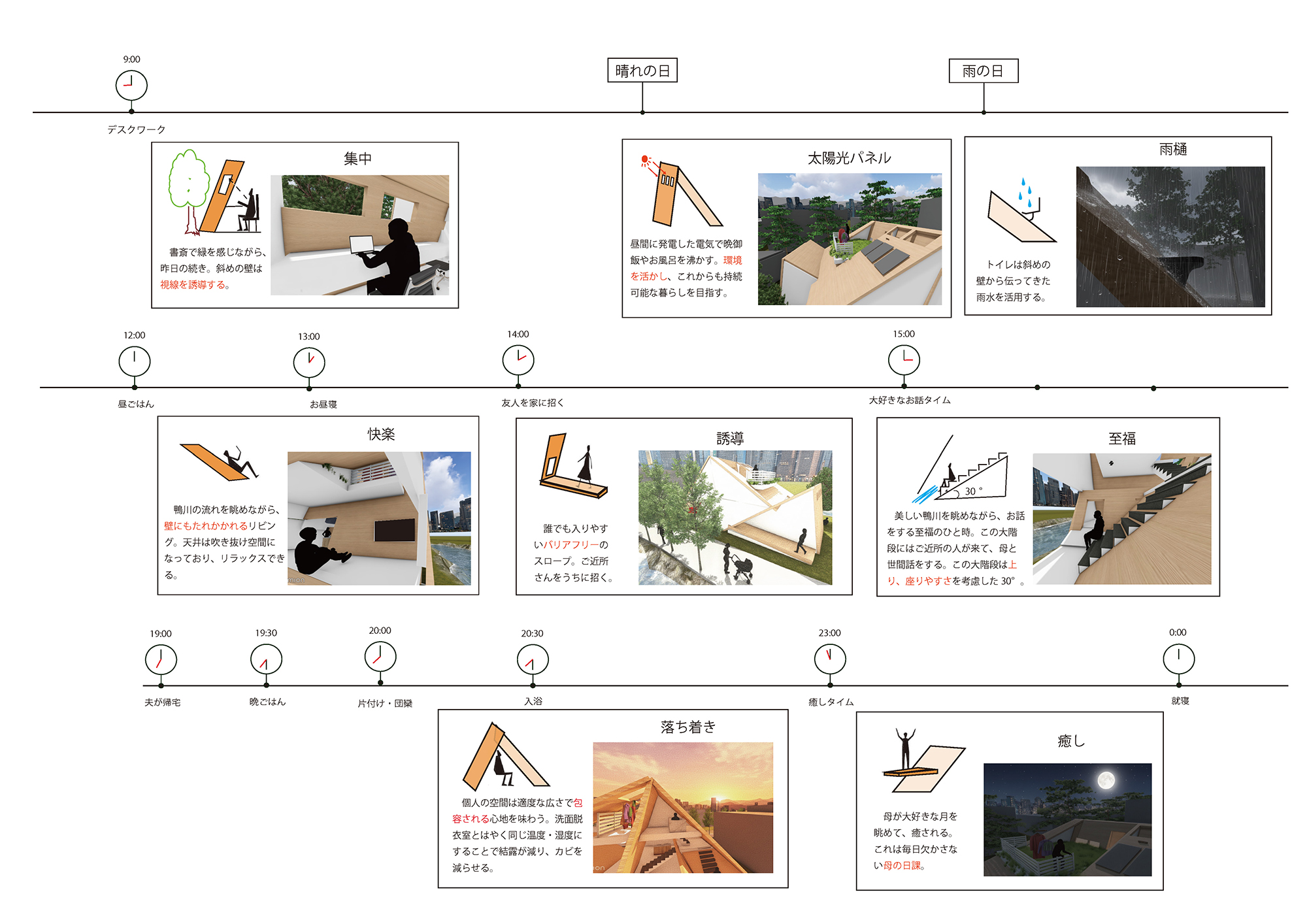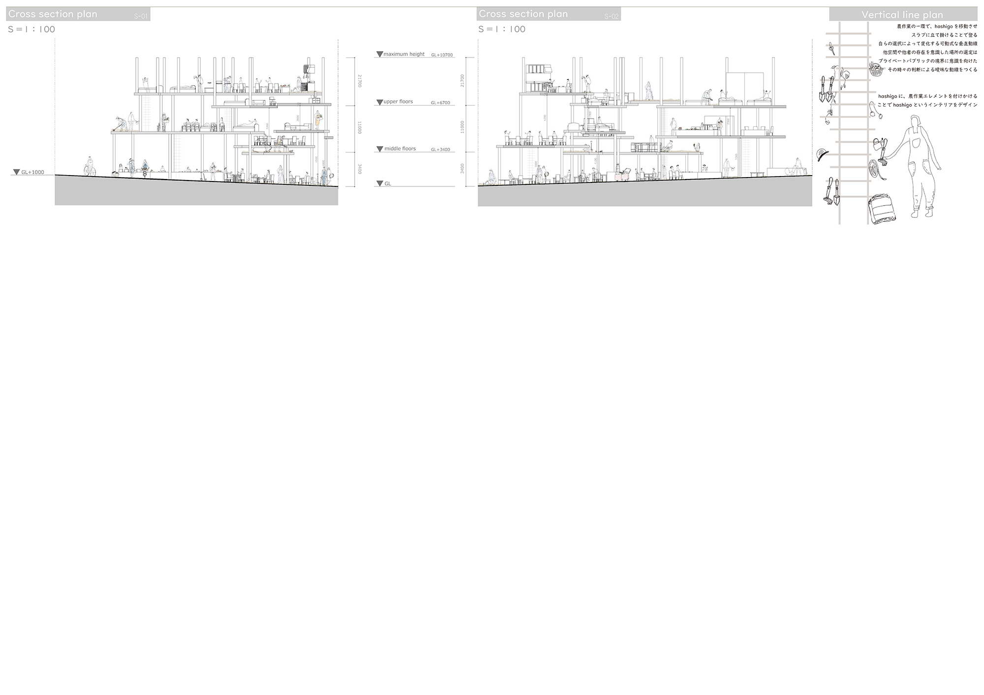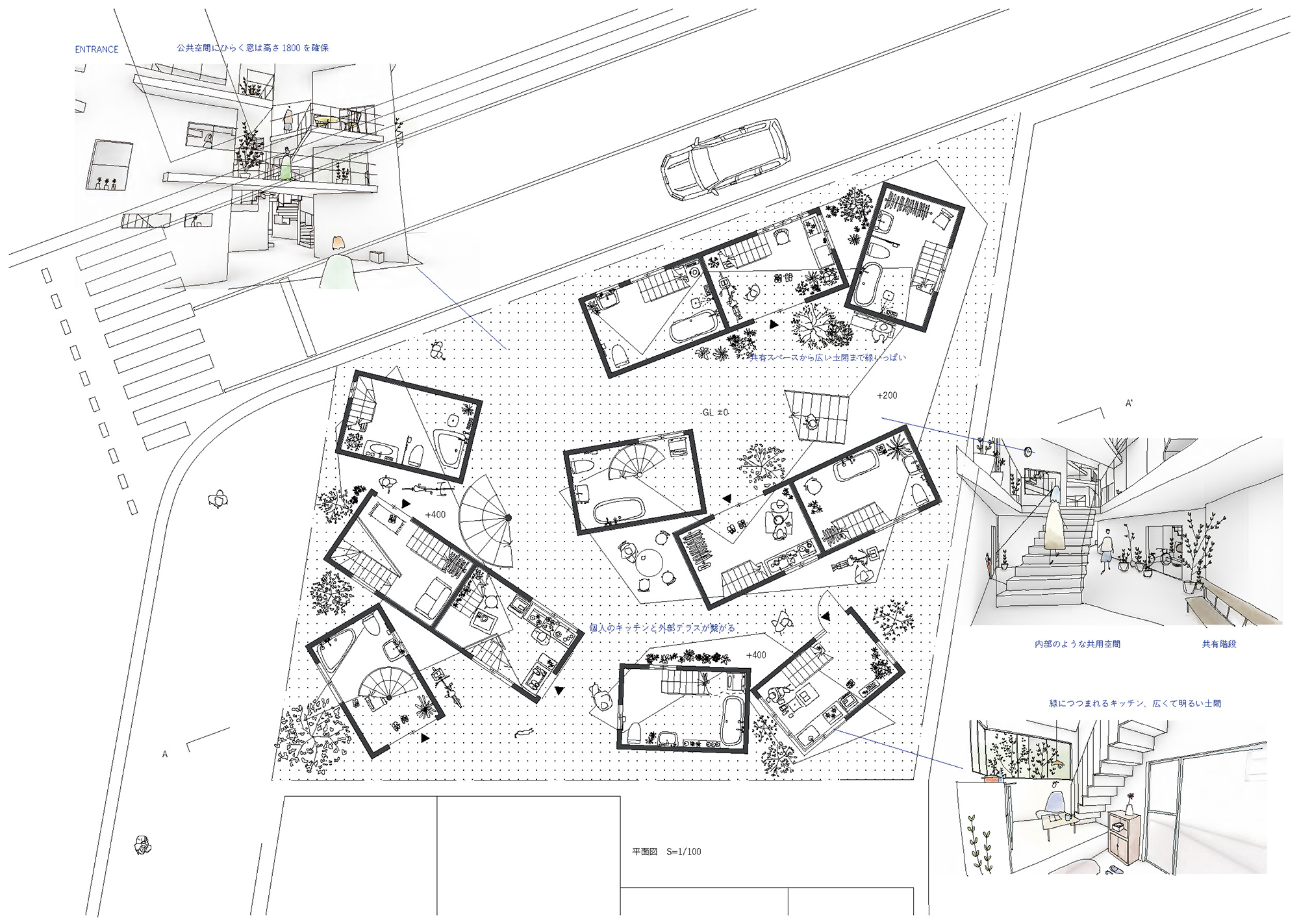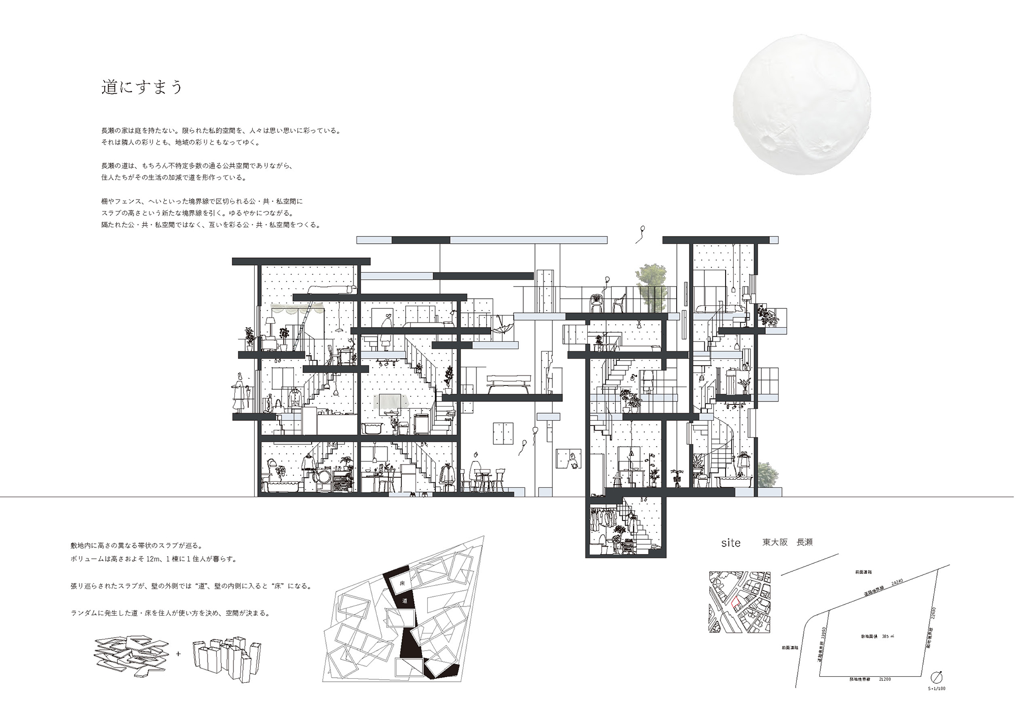 「道にすまう」は、一次審査では、内容が読み取りづらい印象でしたが、二次審査では、気づきの発端となった地域のシーンから説明されたので、よくわかりました。一次審査の資料にも、盛り込まれているとより良かったと思います。共用部の使われ方や、道としての礼儀みたいなものが、設計された建築の中でも、わかりやすく表現されていれば、もっとのめり込めたのではないかと思いました。