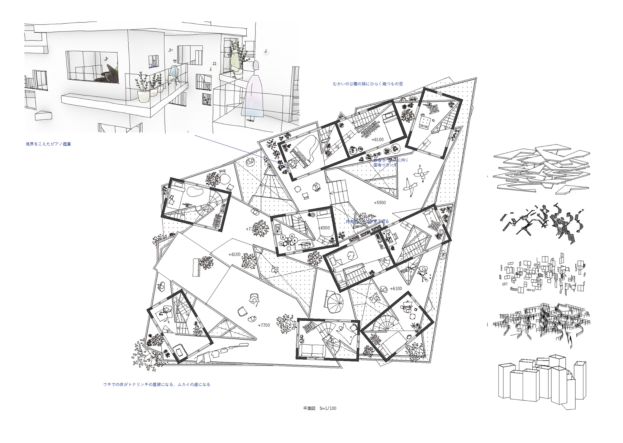 もう一つの優秀賞となった楠部のどかさんによる「道にすまう」は、ランダムに配置した直方体をさらに不規則なスラブによって貫くことで生まれた空間を集合住宅として作り込むというユニークな提案である。この設計プロセスにどういう意義があるのかは、理解できたわけではない。しかし空間を形作る一つの方法として考え出し、やり抜いて見せた力量に可能性を感じた。
