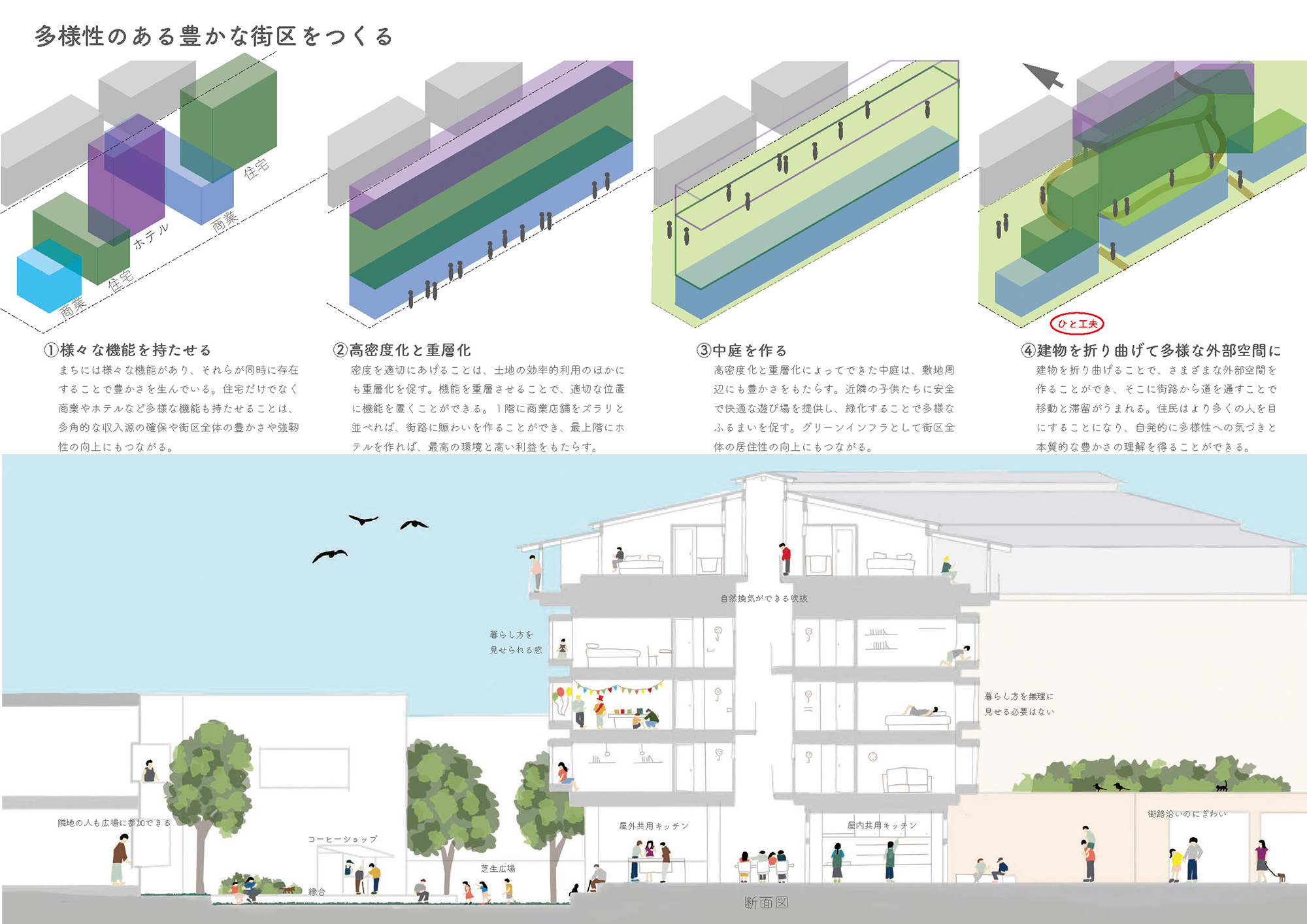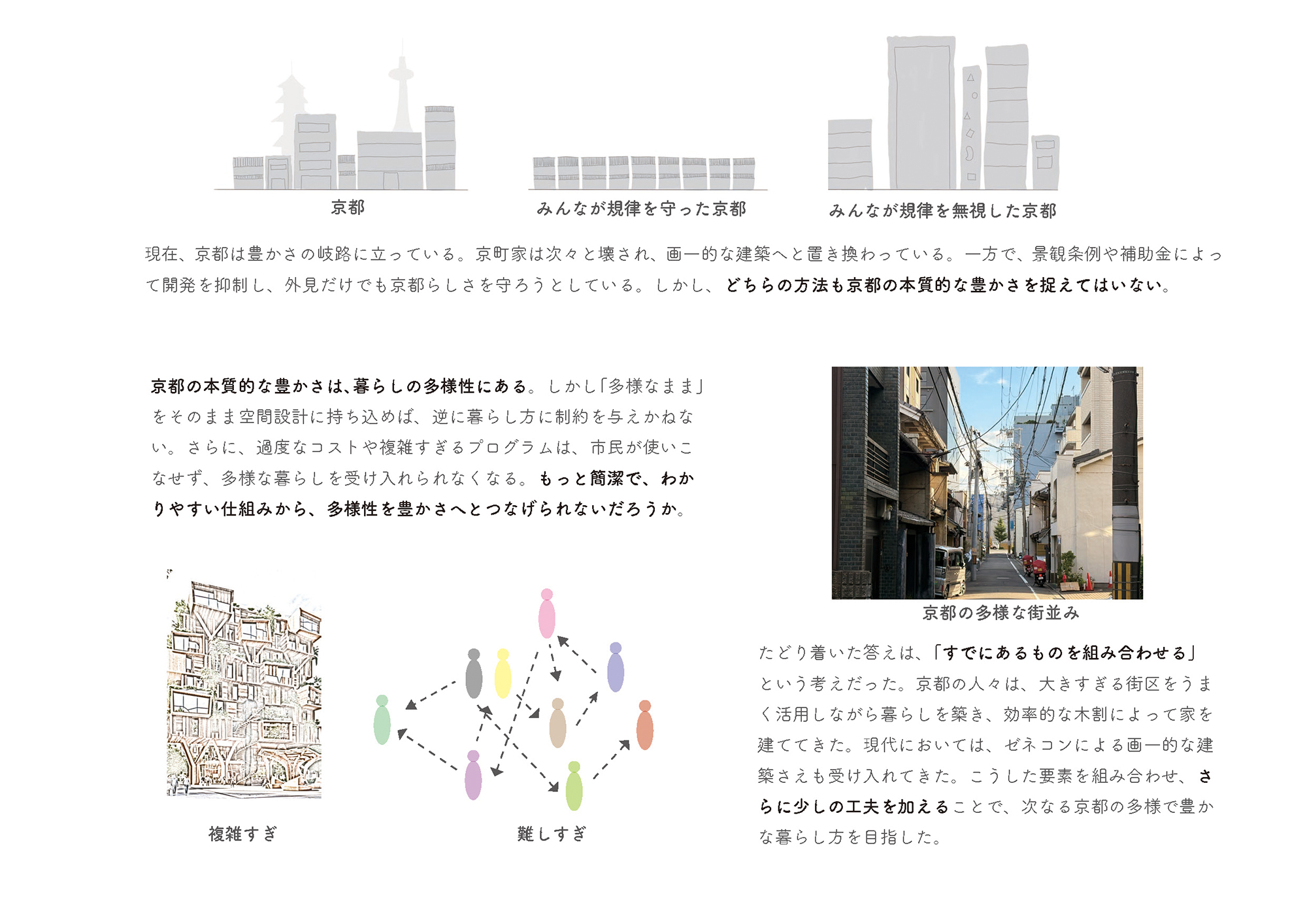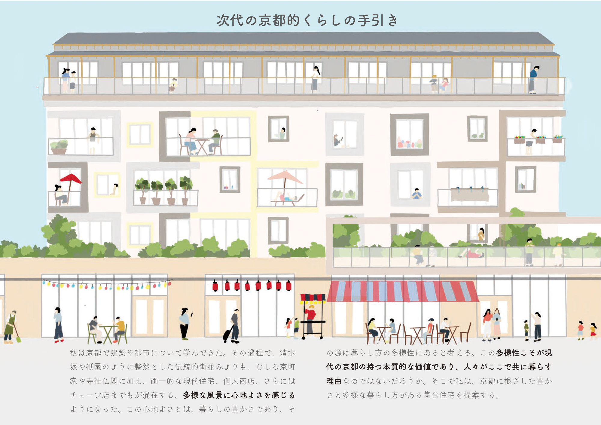 有吉一騎さんによる「次代の京都的くらしの手引き」は、街並みや政策を踏まえた現実的な提案に驚かされた。「多様性が京都の魅力」との分析に基づき、長い棟を折り曲げ、中庭や吹き抜けを織り込むことで、多様な要素を混ぜ合わせる複合的な集合住宅の提案だった。文章も明快で、「景観条例」や「補助金」といった現代京都の都市政策の事情を把握した上で自らの考えを建築に昇華した骨太な計画は高く評価できる。